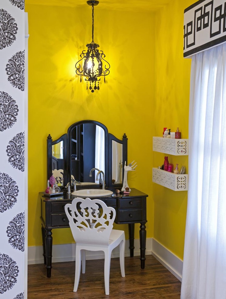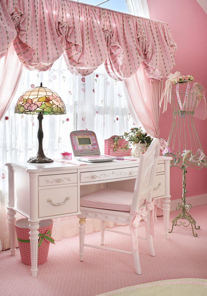 La chambre de la fille dans le style néoclassique avec une longue table combinant les fonctions d'écriture et de coiffeuses