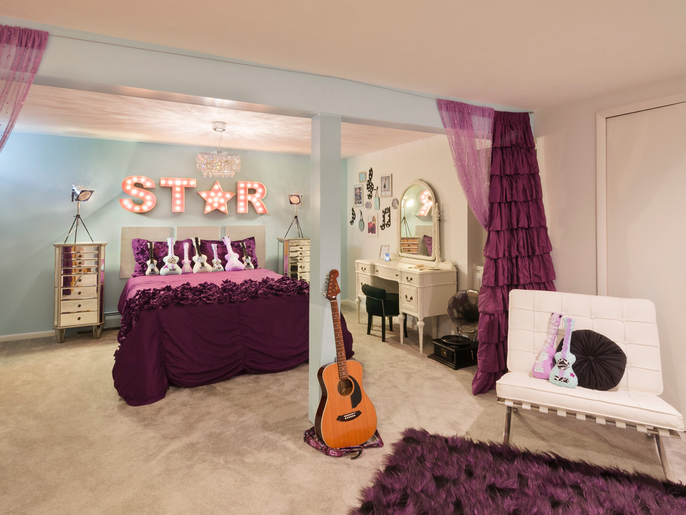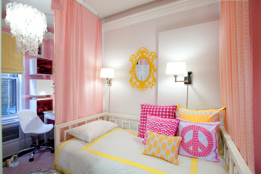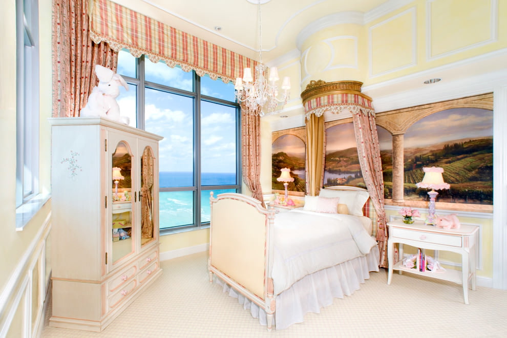 Une zone de boudoir élégante est prévue dans les murs élégants.Les adolescentes ont besoin d'un grand miroir ou d'un treillis. La garde-robe de fille est volumineuse. La pièce devrait avoir une place pour les épingles à cheveux, les bijoux, les cosmétiques, le parfum. L'intérieur est créé dans des couleurs douces, une grande attention est accordée aux textiles. Le lit peut être remplacé par un canapé, la chaise par un pouf doux.