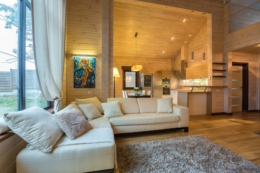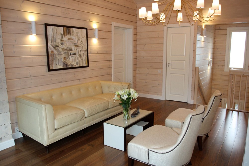 Ένα φωτεινό καθιστικό σε ένα ξύλινο σπίτι είναι μια κομψή λύση. Τα ανοιχτά χρώματα στη διακόσμηση θα κάνουν το δωμάτιο πιο οπτικά πιο ευρύχωρο, πιο ελεύθερο. Με αυτό το φινίρισμα, δεν χρειάζεστε πολύ φωτισμό. Προτεραιότητα πρέπει να δοθεί στις πηγές διάχυτου φωτός. Μπορούν να είναι μικρές λάμπες ενσωματωμένες στην οροφή, λαμπτήρες δαπέδου, απλίκες τοίχου. Οι λαμπτήρες, για παράδειγμα, με τη μορφή λαμπτήρων δρόμου, θα ταιριάζουν απόλυτα σε ένα σπίτι από ένα μπαρ.