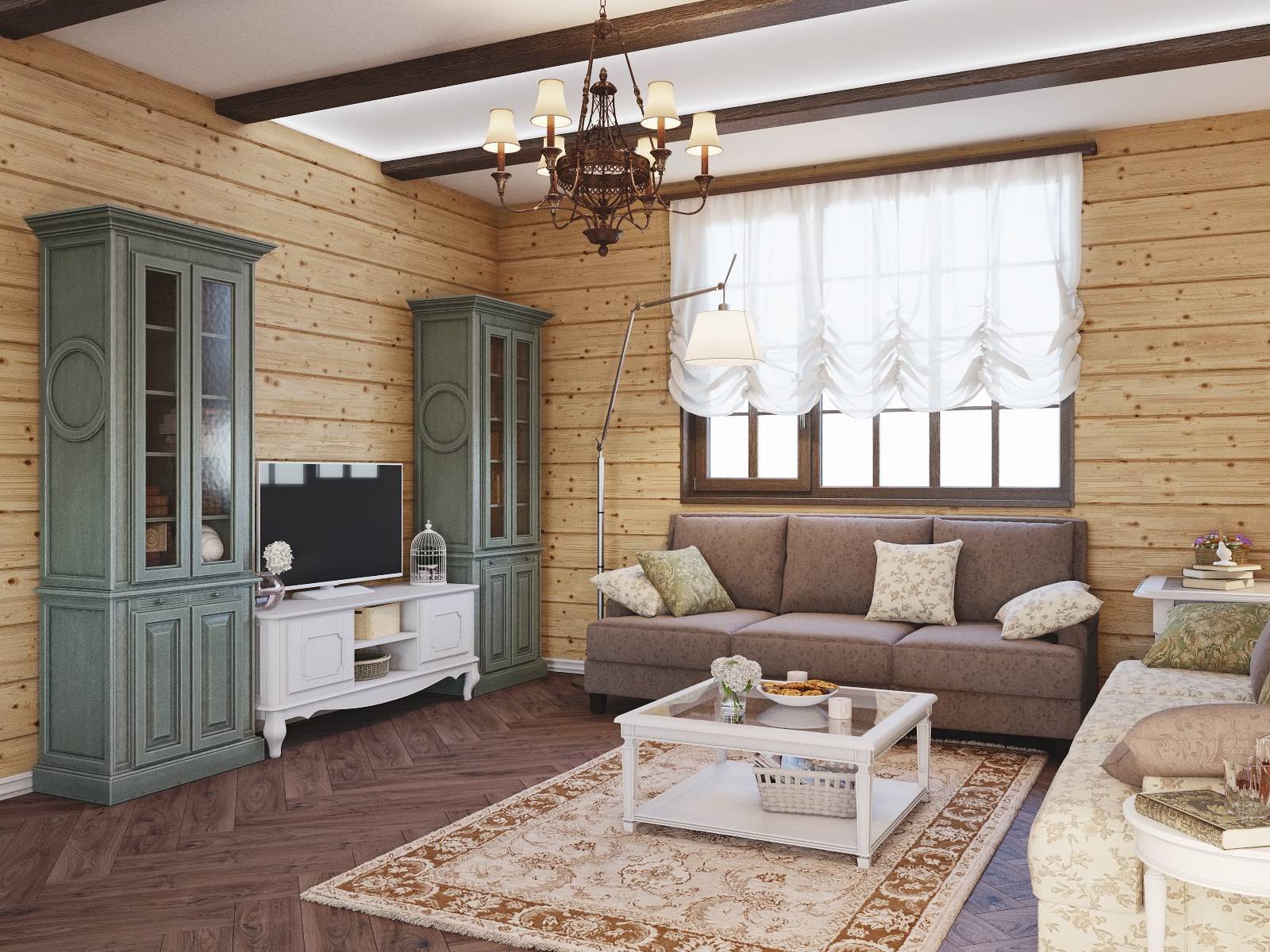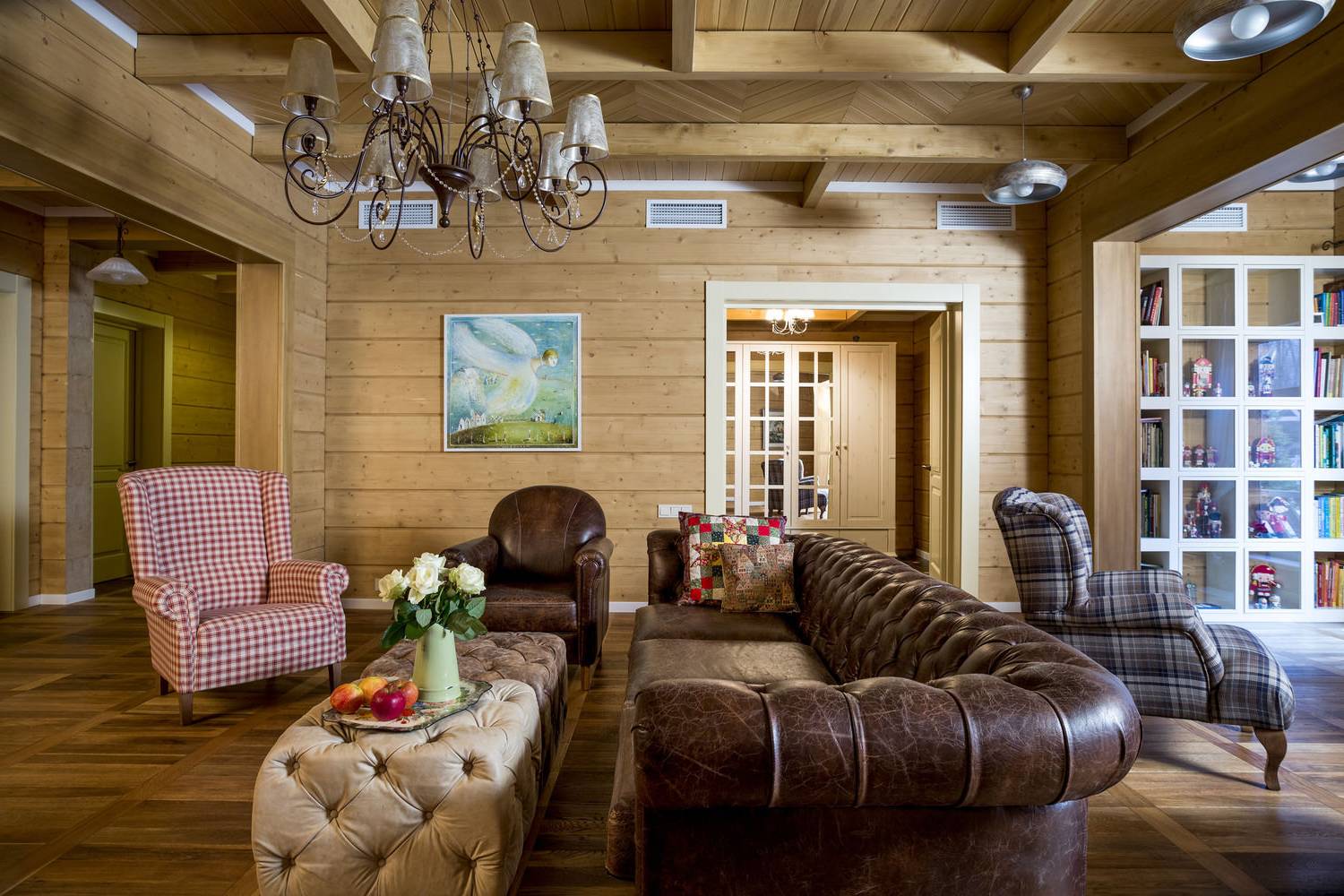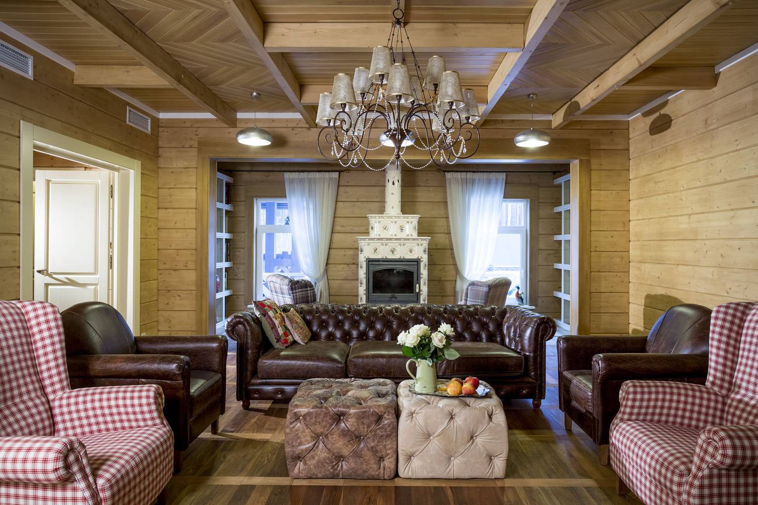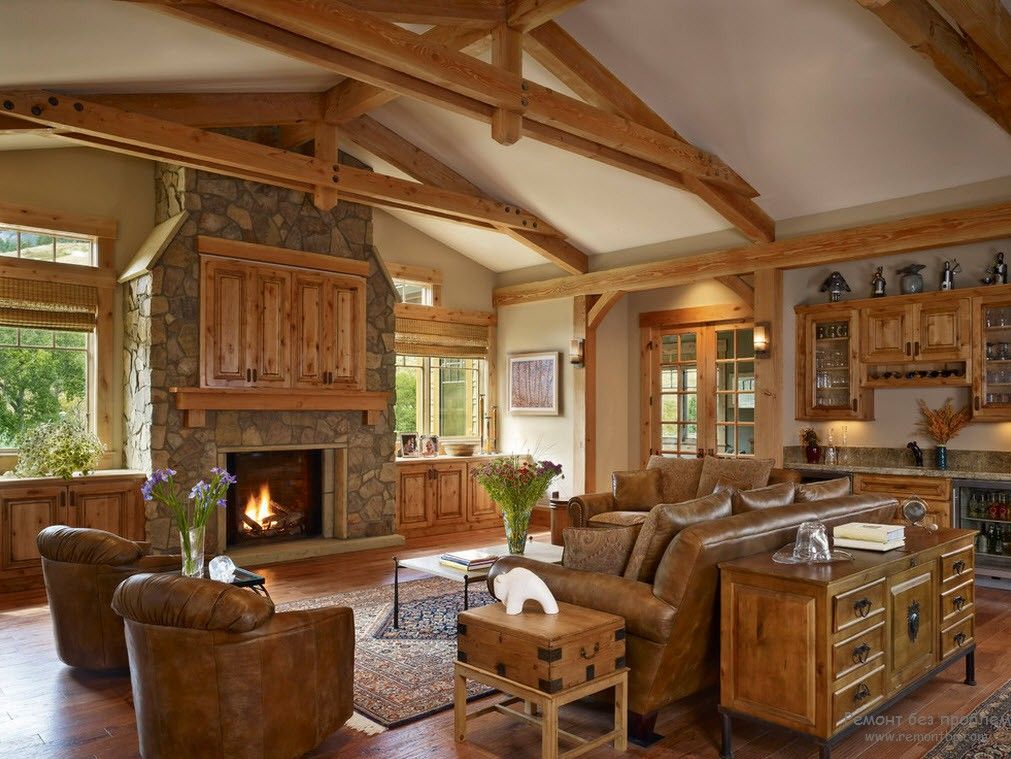 - Φωτογραφίες του σχεδιασμού ενός καθιστικού σε ένα ξύλινο σπίτι