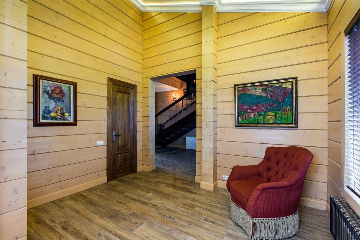 - Υλικά για τους τοίχους. Η διακόσμηση τοίχων σε ξύλινο δωμάτιο μπορεί να είναι πιο ποικιλόμορφη. Μπορείτε να χρησιμοποιήσετε πλακάκια, ψηφιδωτά, φυσική πέτρα, γυαλί, επένδυση.Πλακάκια και ψηφιδωτά θα είναι κατάλληλα στον τοίχο κοντά στο τζάκι. Με τη βοήθεια φυσικής πέτρας, μπορεί να διακρίνεται ένας τοίχος προφοράς και οι υπόλοιπες επιφάνειες μπορούν απλά να βαφτούν και να βαφτούν. Επένδυση - ένα υλικό προϋπολογισμού για διακόσμηση. Ωστόσο, μπορεί ιδανικά να ταιριάζει σε μερικά εσωτερικά στυλ, όπως το στυλ της χώρας.
