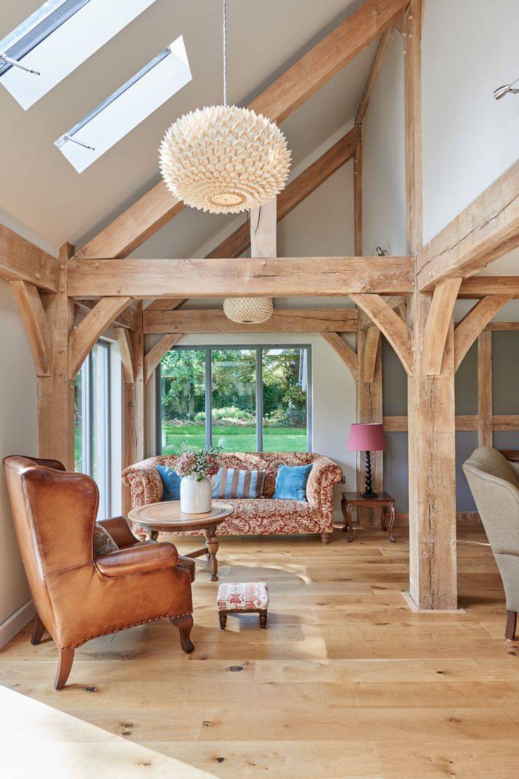 Ευρύχωρο σαλόνι ξύλινης κατοικίας με στυλ μινιμαλισμού