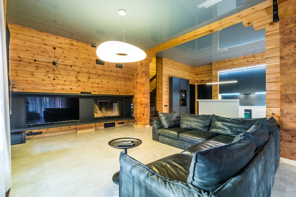 Το εσωτερικό του σαλόνι σε ένα ξύλινο σπίτι συμπληρώνει αποτελεσματικά το πάτωμα των βερνικωμένων σανίδων
