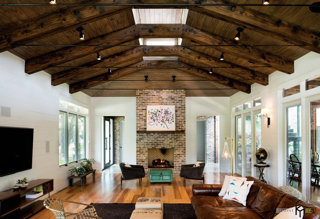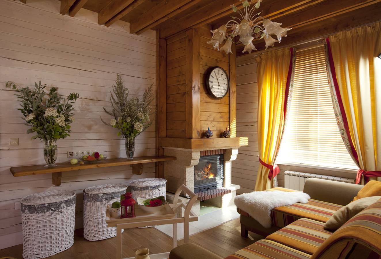 Επιλέγοντας την κατεύθυνση του στυλ, καθορίζοντας το επιθυμητό σχήμα χρωμάτων, θα πρέπει να προχωρήσετε στη διακόσμηση του καθιστικού. Μπορείτε να δείτε παραδείγματα διακοσμήσεων σαλόνι σε μια ξύλινη κατοικία στη φωτογραφία.