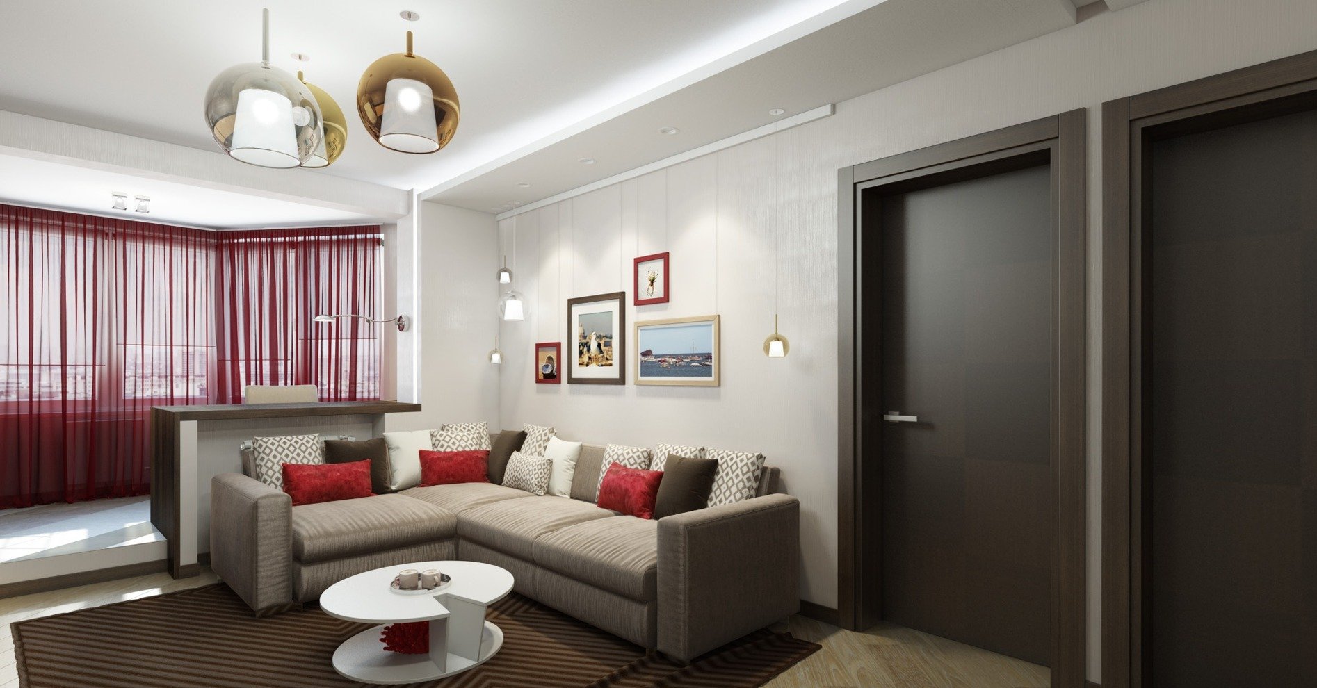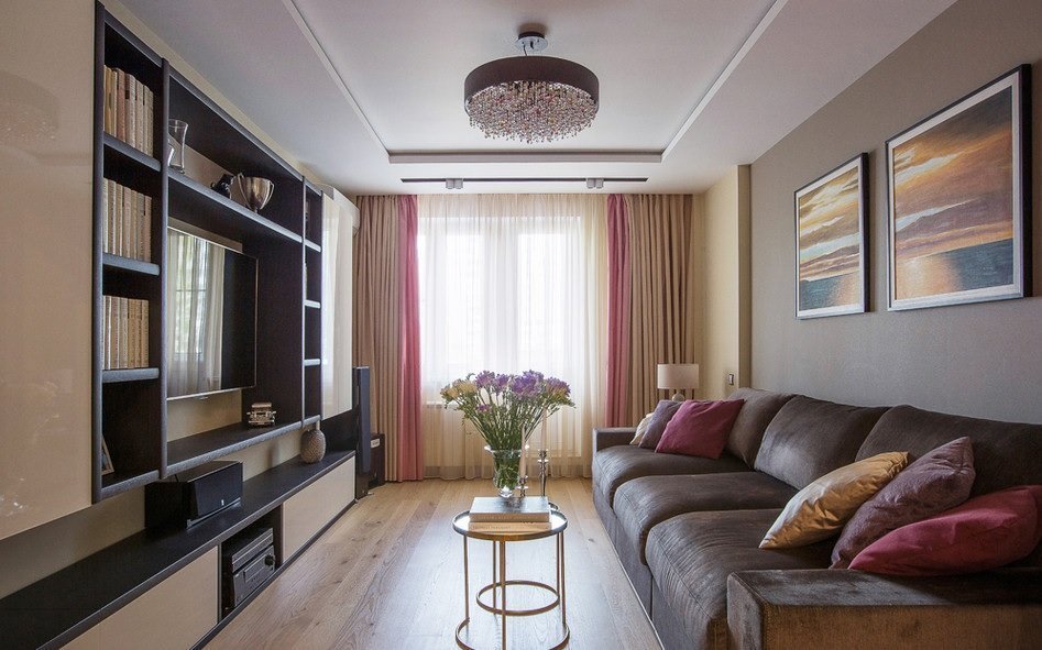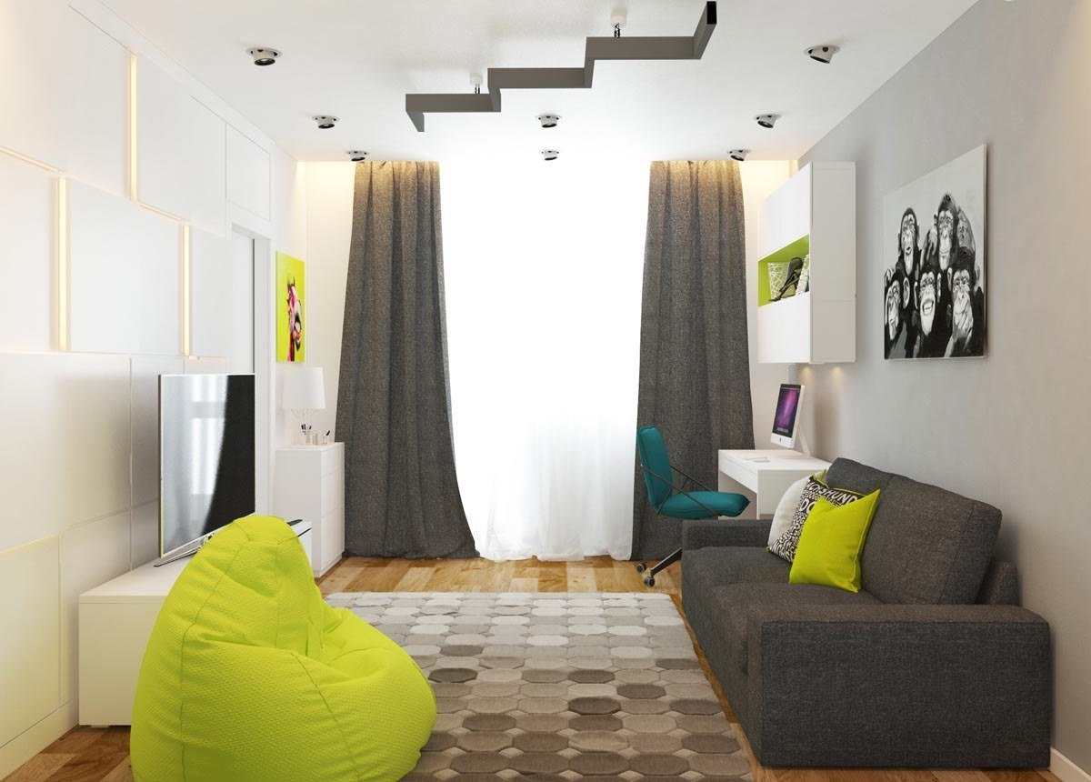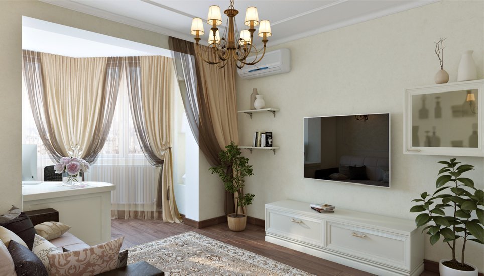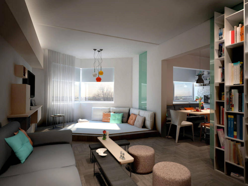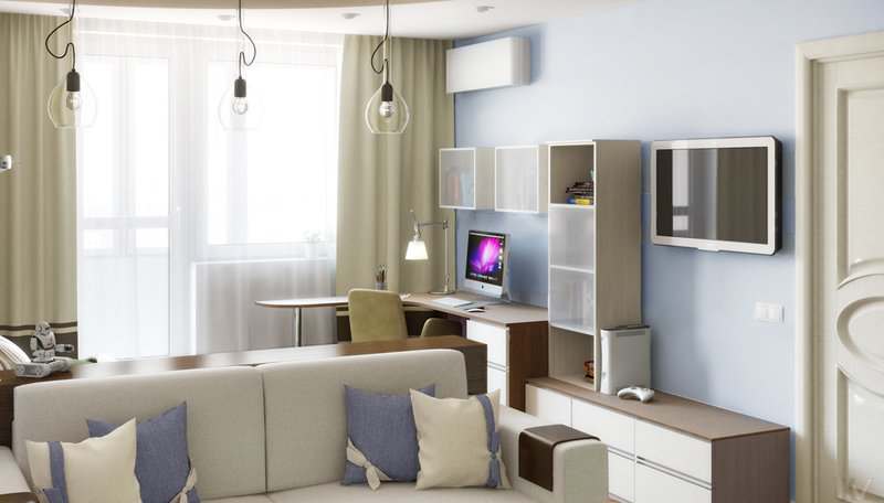 Η δυνατότητα διαίρεσης του καθιστικού σε ζώνες για παιδιά και ενήλικες. Ο χώρος εργασίας τοποθετείται στο μονωμένο μπαλκόνι, το κρεβάτι ενηλίκων χωρίζεται από ένα ελαφρύ διαμέρισμα