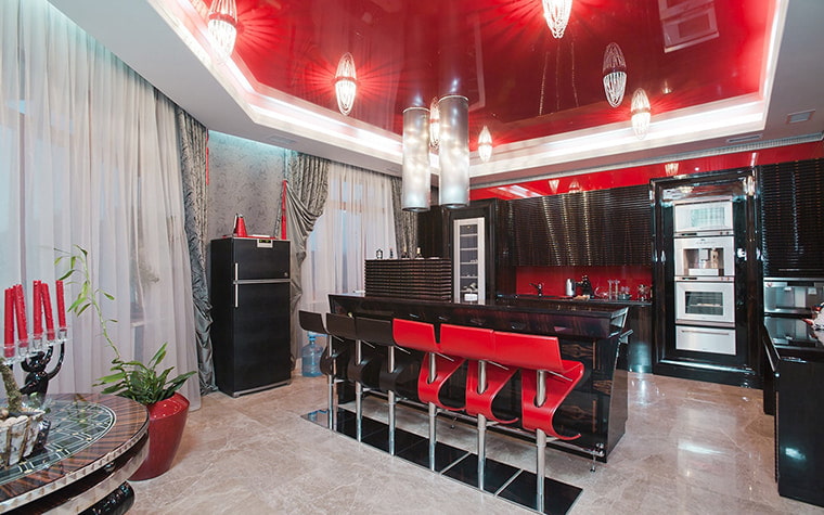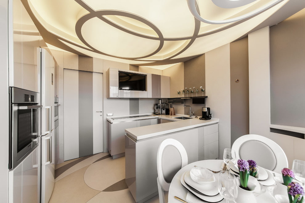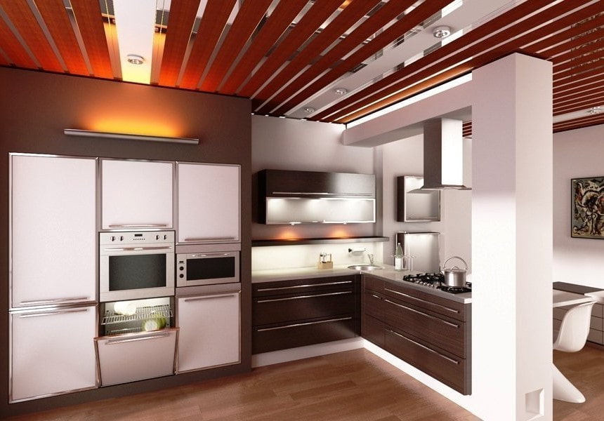 Χρησιμοποιώντας την επίστρωση οροφής, μπορείτε να αλλάξετε οπτικά τις διαστάσεις της κουζίνας, να ζωνάρετε το χώρο και να δημιουργήσετε το επιθυμητό στυλ εσωτερικού χώρου