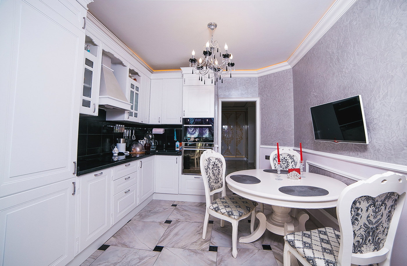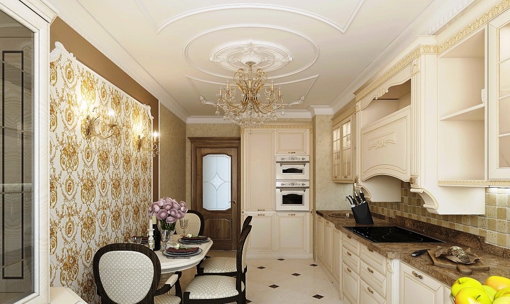 Χρησιμοποιώντας τη γκάμα από γυψομάρμαρο, μπορείτε να δημιουργήσετε τόνους, να διαιρέσετε την κουζίνα σε λειτουργικές ζώνες και να προσθέσετε σημειώσεις κλασικού στυλ στο εσωτερικό