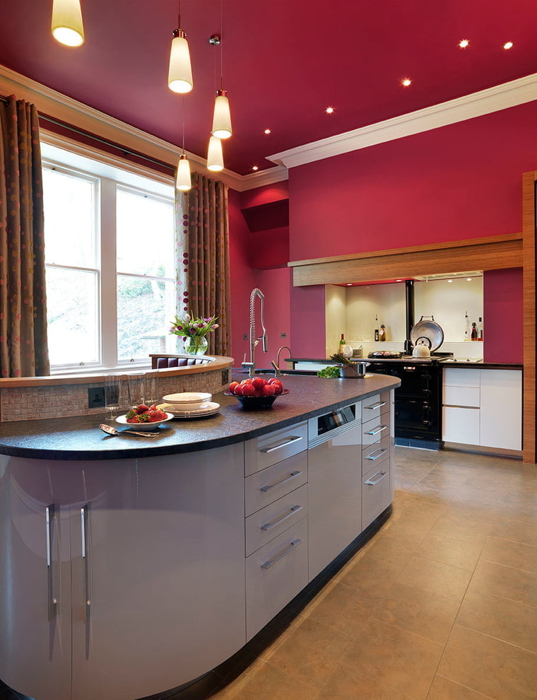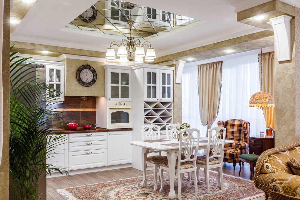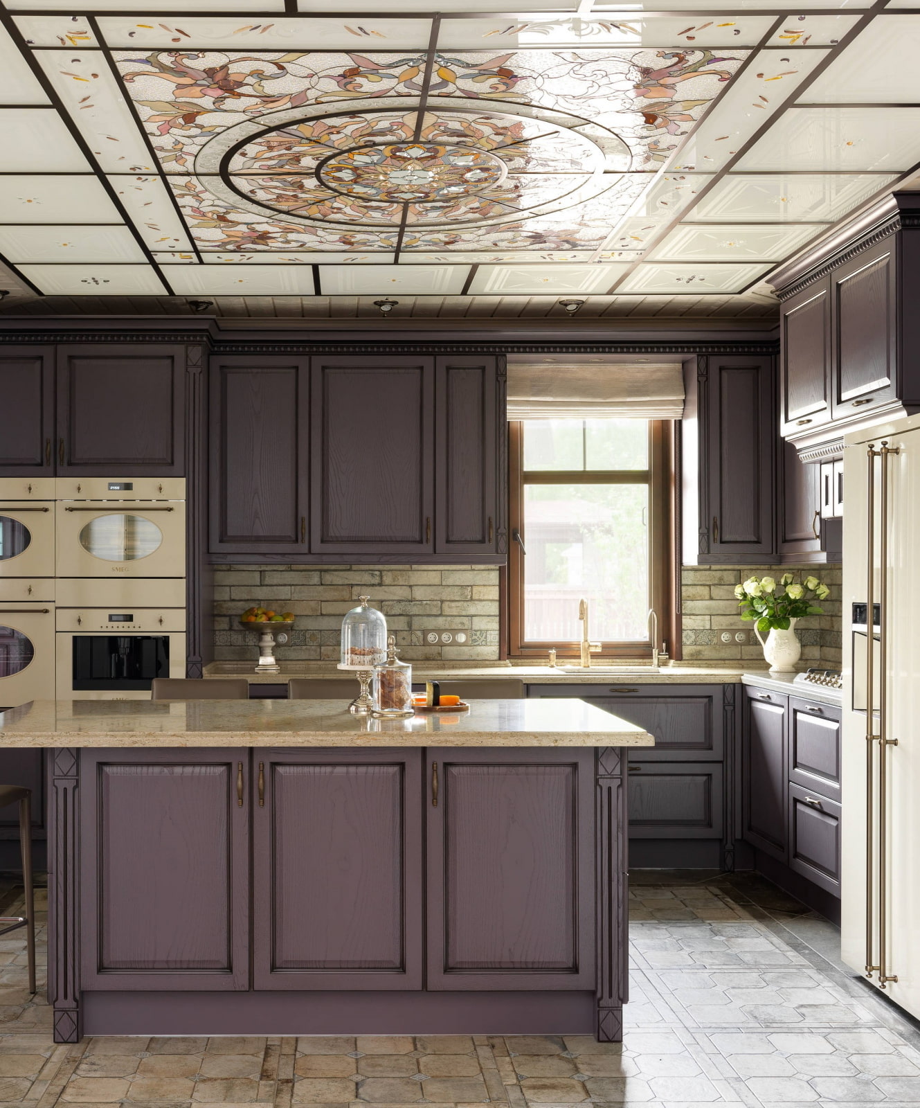 Μια κεκλιμένη οροφή χρησιμοποιείται συχνά όταν σχεδιάζετε μια κουζίνα σε κλασικό ύφος.