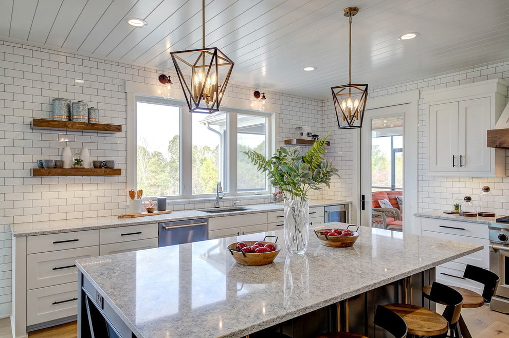 Κουζίνα εξοχική κατοικία με λευκές ξύλινες διακοσμημένες οροφές
