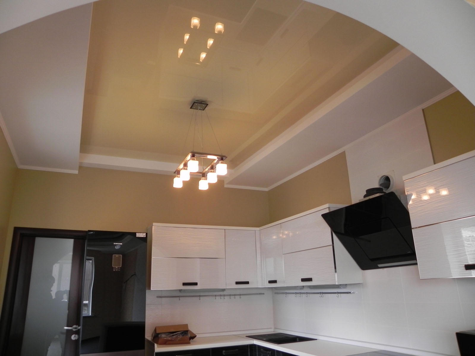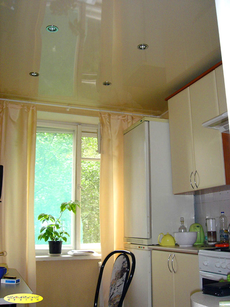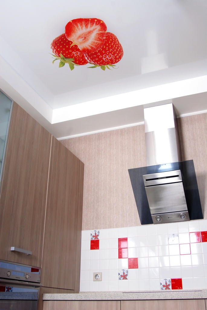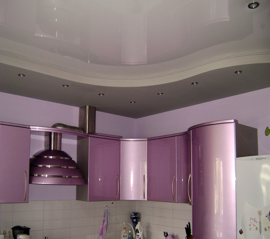 Επένδυση PVC-πανί - μια ανθεκτική και ελκυστική επιλογή για το σχεδιασμό της οροφής της κουζίνας. Σας επιτρέπει να αποκτήσετε γρήγορα και εύκολα μια τέλεια επίπεδη επιφάνεια οποιουδήποτε σχεδίου