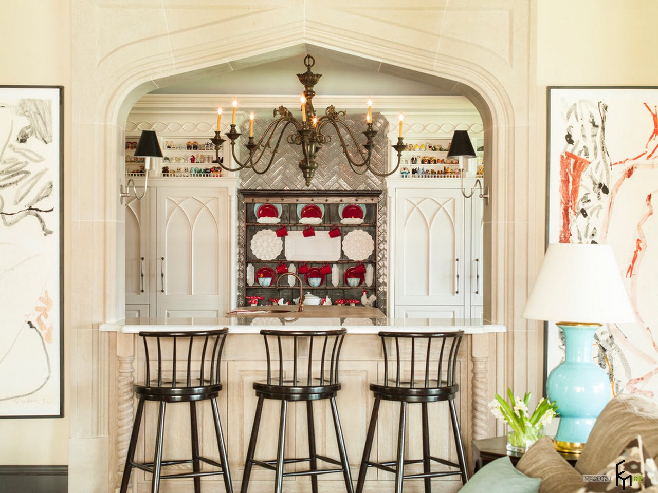 Για να διακοσμήσετε το εσωτερικό, επιλέξτε ωραία ρολόγια τοίχου, φυτά εσωτερικού χώρου σε πήλινα αγγεία, κεραμικά πιάτα, αγγεία, κύπελλα φρούτων, καλάθια, γυάλινα μπουκάλια για λάδι και κρασί.