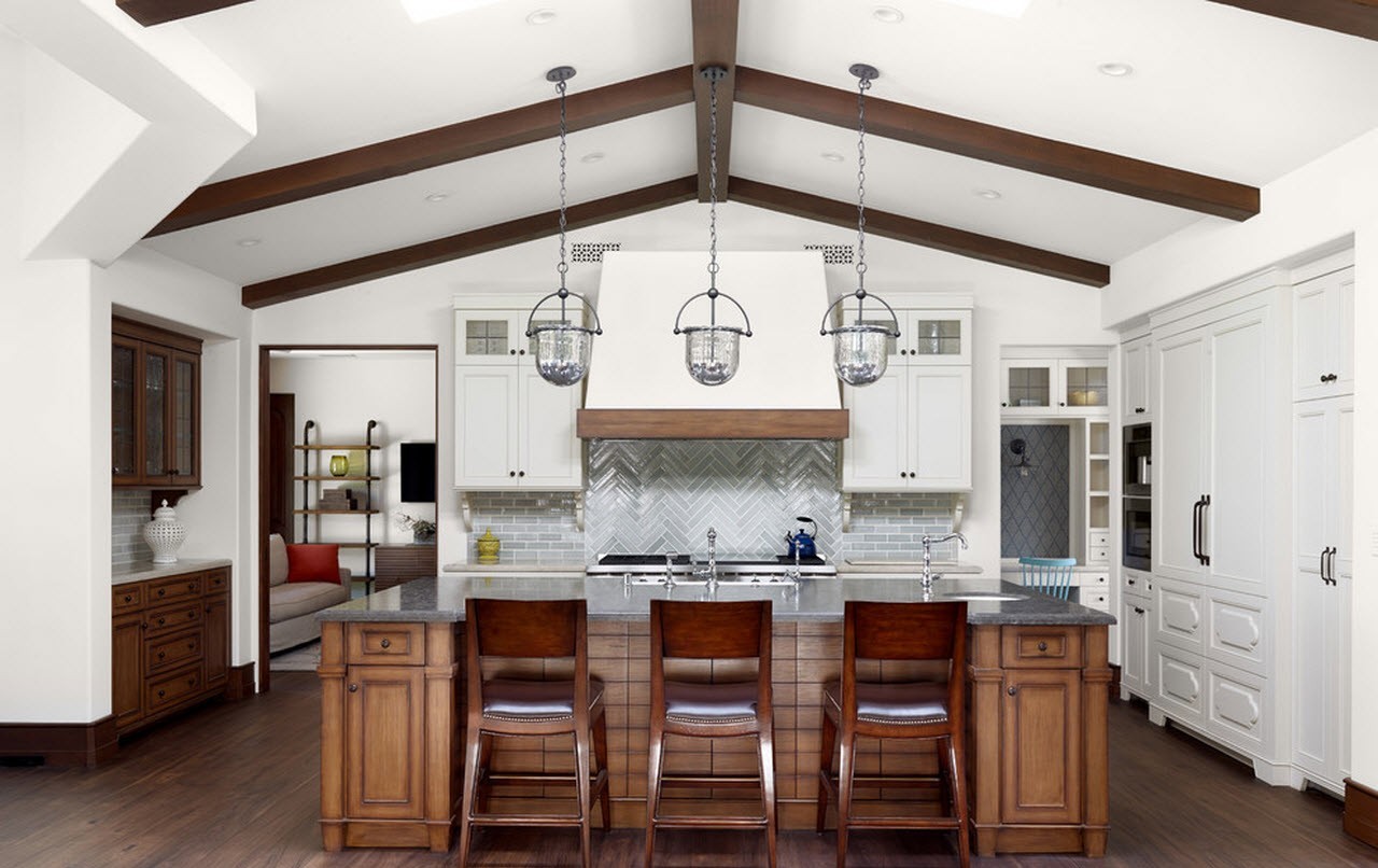 Ξύλινα δοκάρια από σκούρο ξύλο ή απομίμηση πλαστικών ή γυψοσανίδων θα βοηθήσουν να τονιστεί η τραχιά τραχύτητα της οροφής.