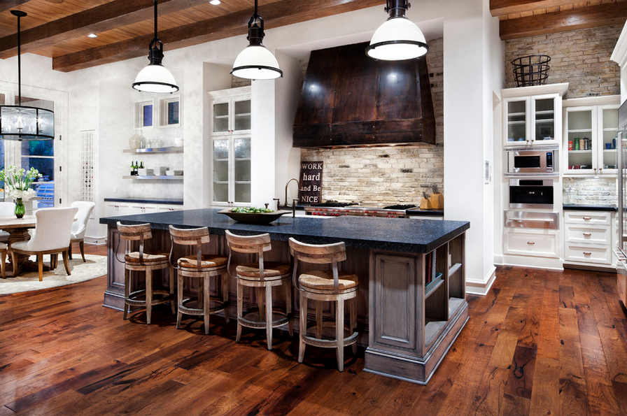 Στο μεσογειακό στυλ, το σαλόνι κουζίνας φαίνεται ελκυστικό και λειτουργικό, γιατί στην περίπτωση αυτή μια μεγάλη οικογένεια ή μια ομάδα φίλων μπορεί να συγκεντρωθεί σε ένα κοινό τραπέζι.