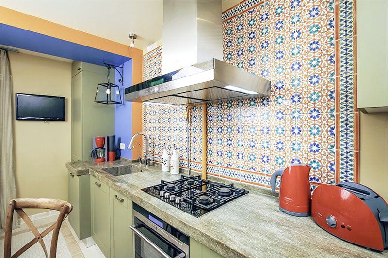 - κεραμικά πλακίδια με κεραμίδια και μαγιολίτσα ως ποδιά του χώρου εργασίας.