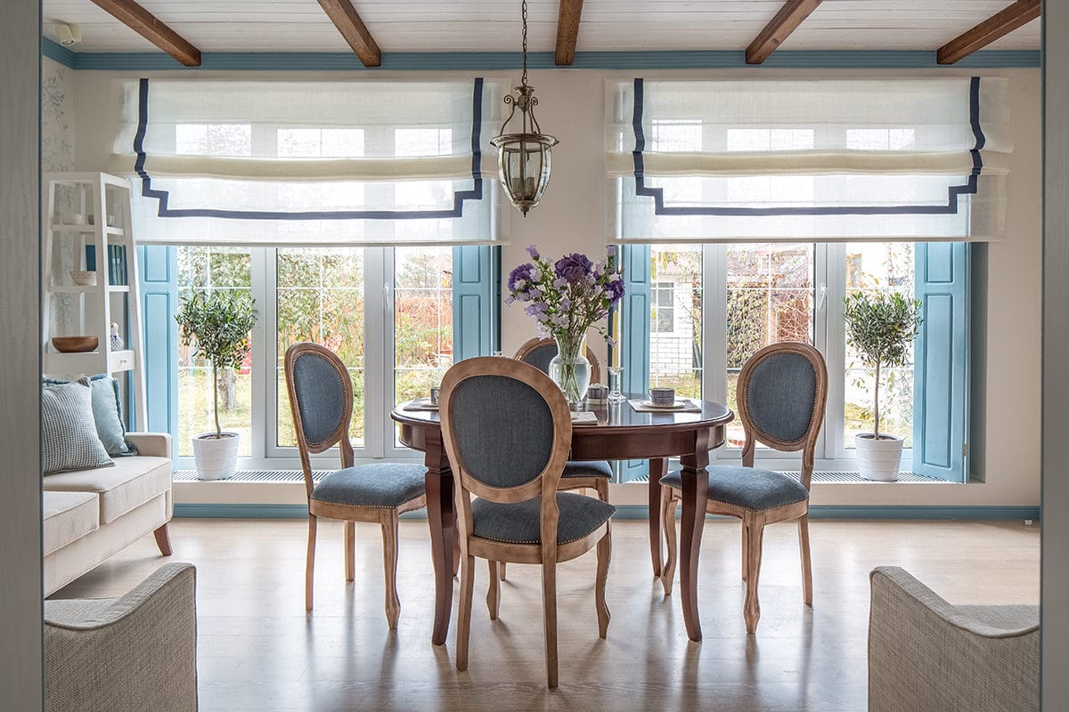 Για το μεσογειακό ύφος στο εσωτερικό της κουζίνας, οι κουρτίνες έχουν μεγάλη σημασία, που όχι μόνο διακοσμούν το εσωτερικό αλλά και προστατεύουν το δωμάτιο από τον ζεστό νότιο ήλιο.