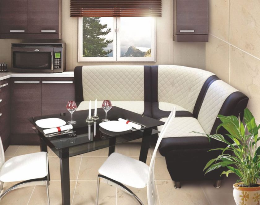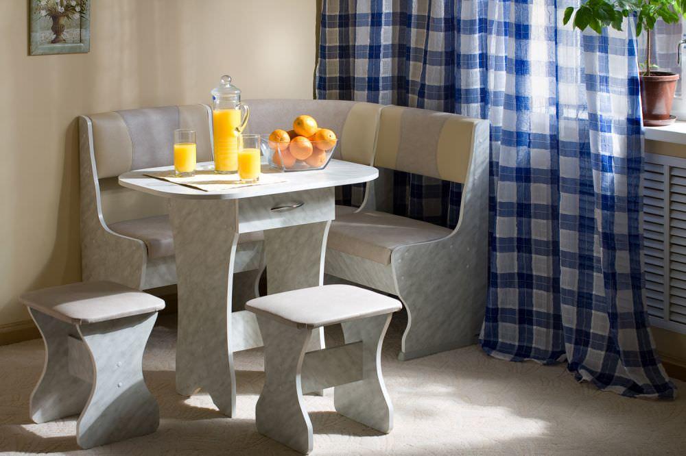 Αξίζει να σταματήσετε την επιλογή μιας λευκής ή ελαφριάς μπεζ γωνίας, επειδή σε μια μικρή περιοχή θα φανεί πολύ μαζική, ογκώδης. Μπορείτε να επιλέξετε αυτό το χρώμα, αν το υπόλοιπο των επίπλων στην κουζίνα είναι λευκό, τότε το δωμάτιο θα γίνει πιο ευάερο.