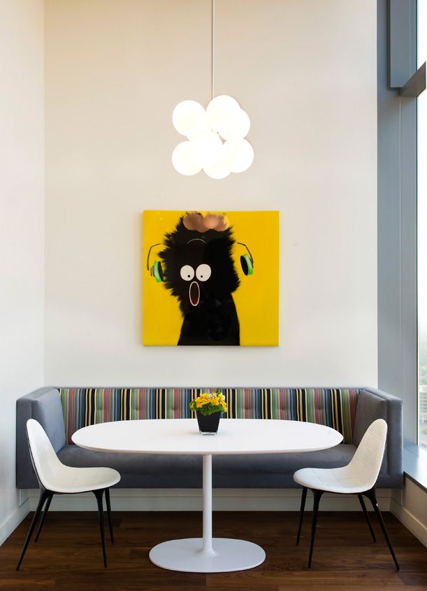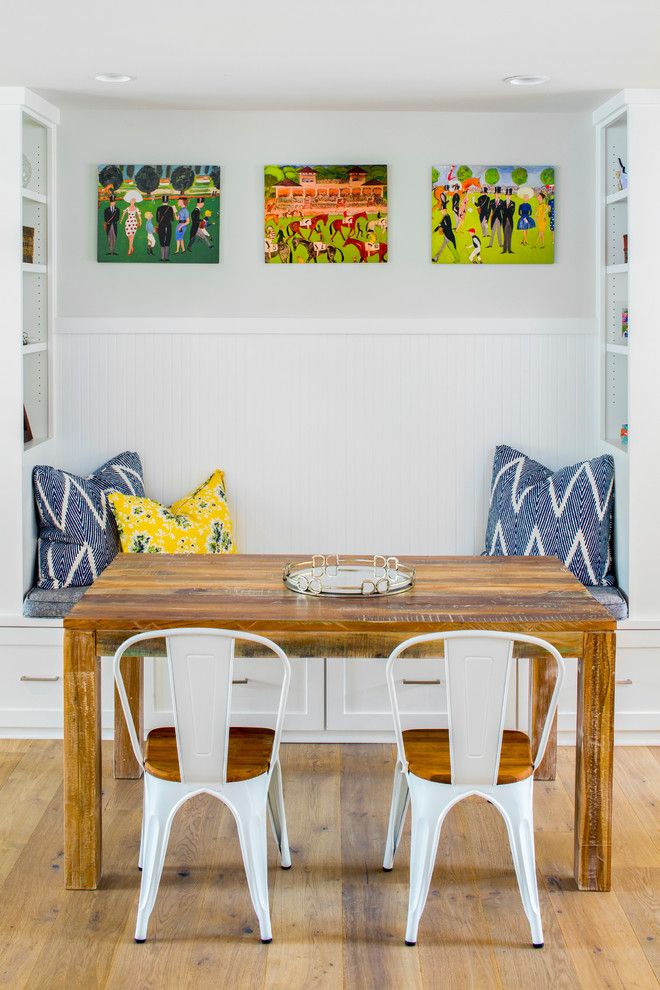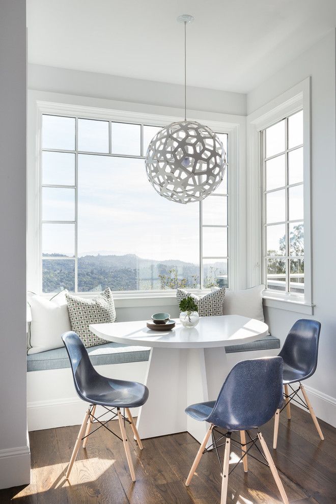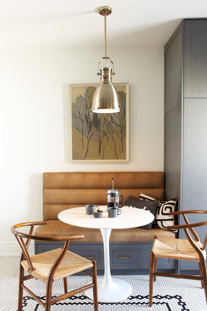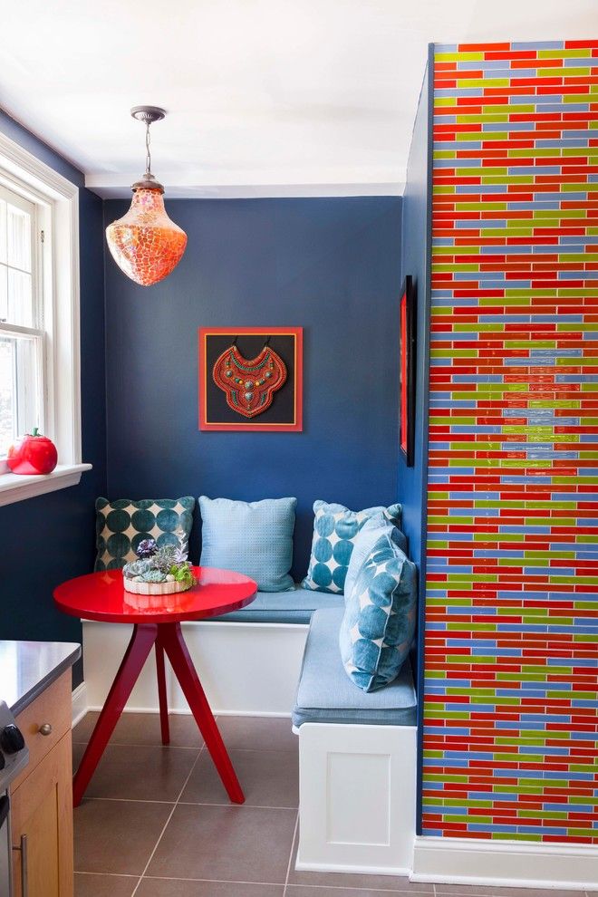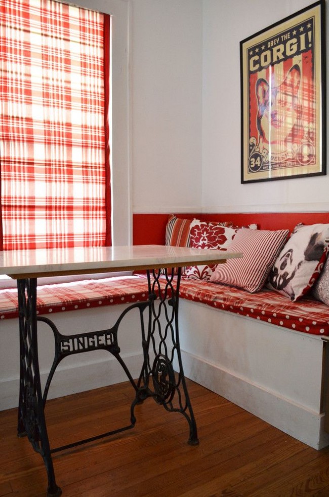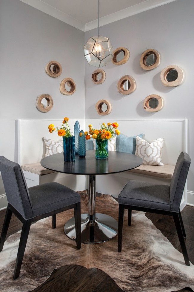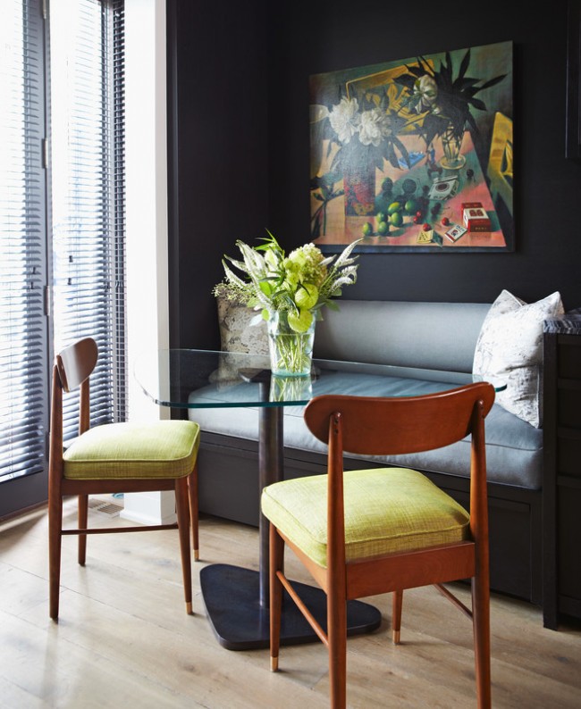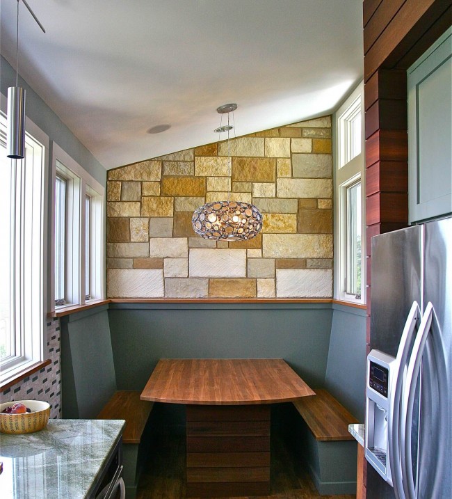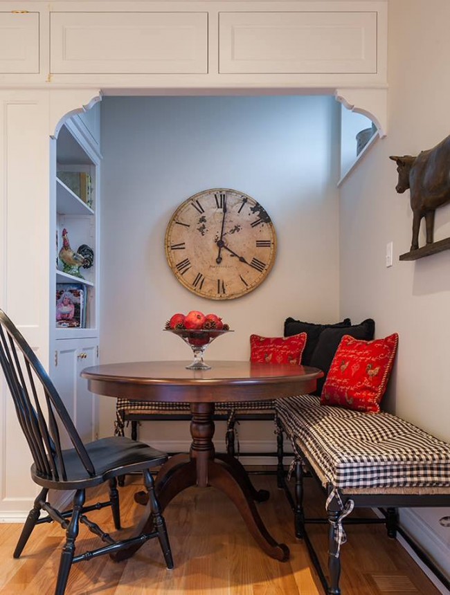 Φαίνεται εντυπωσιακό όταν η γωνιά της κουζίνας αντηχεί με τη συνολική σχεδίαση της κουζίνας, είτε είναι η διακόσμηση στους τοίχους, τα έγχρωμα ένθετα στα ντουλάπια της κουζίνας. Αυτό προσθέτει αρμονία και χώρο σε ένα μικρό δωμάτιο.