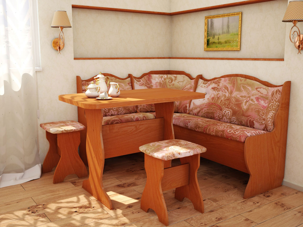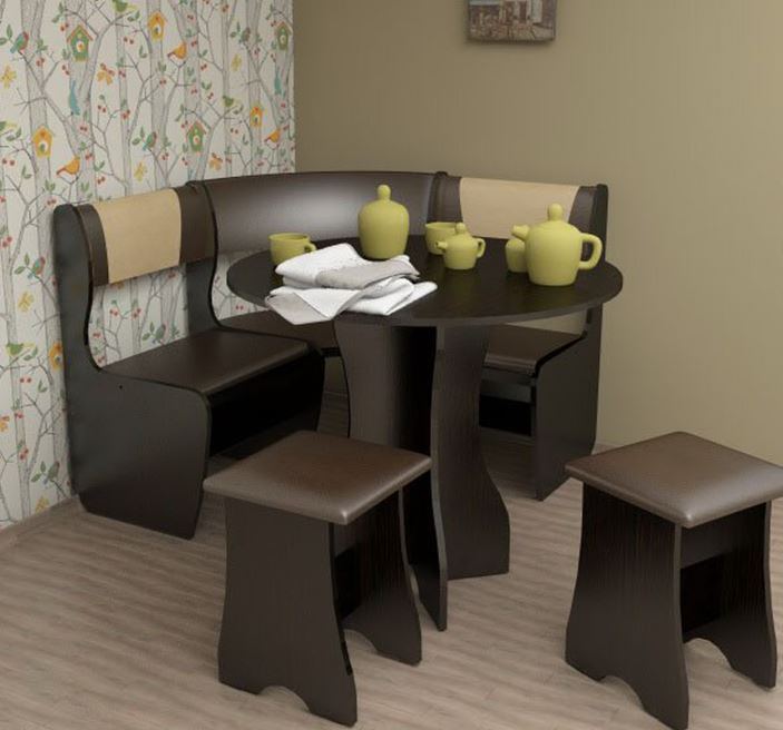 Η αισθητική αντίληψη του σχεδιασμού της κουζίνας είναι πολύ σημαντική. Εάν ολόκληρη η κουζίνα είναι κατασκευασμένη σε σκούρα χρώματα, τότε είναι προτιμότερο να επιλέξετε έναν καναπέ με ένα τραπέζι στο ίδιο σχέδιο ή με δύο τόνους ελαφρύτερο και αντίστροφα. Τα ξύλινα έπιπλα φαίνονται κομψά και άνετα. Και αν συμπληρώσετε το πλαίσιο με υψηλής ποιότητας και όμορφη ταπετσαρία, τότε η τραπεζαρία θα γίνει ένα αγαπημένο μέρος για όλα τα νοικοκυριά.
