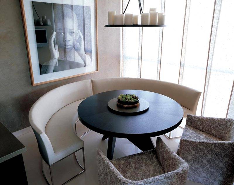 - Ημικυκλικό. Υπενθυμίζουν το σχήμα L σε σχήμα, αλλά πιο λειτουργικό, επειδή η δεξιά γωνία είναι στρογγυλεμένη και μπορεί να χρησιμοποιηθεί ως μια άλλη θέση. Αυτές οι τραπεζαρία φαίνονται ενδιαφέρουσες, συμπληρώνονται από στρογγυλά ή οβάλ τραπέζια, ειδικά αν υπάρχουν ανοιχτά ράφια διακοσμημένα με διακοσμητικά στοιχεία.