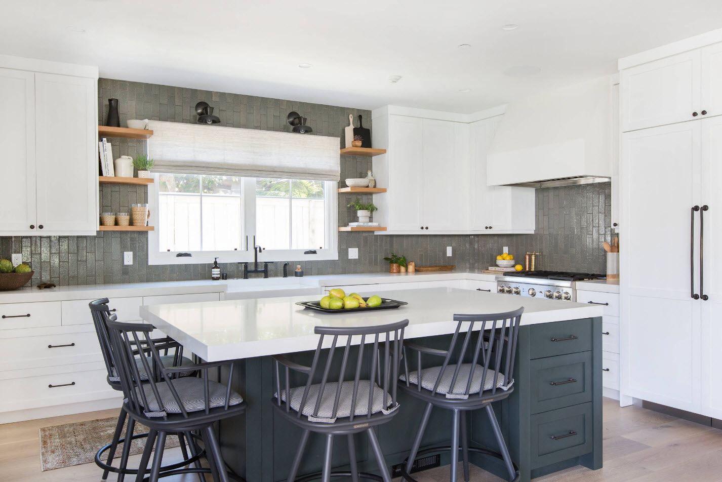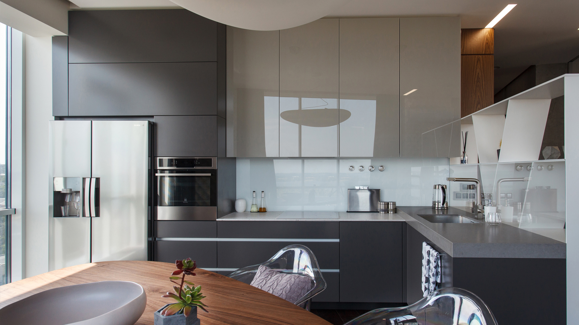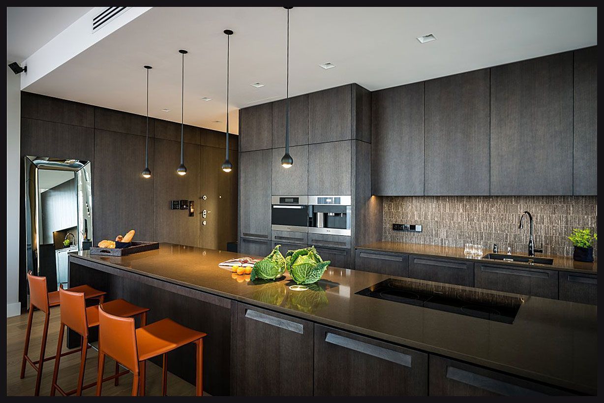 Στη μοντέρνα κουζίνα, οι σκούρες αποχρώσεις χρησιμοποιούνται περισσότερο - γκρι, πράσινο, μαύρο και μπλε