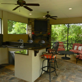 Οι ανοιχτές κουζίνες δεν προστατεύονται σε καμία από τις πλευρές των τοίχων. Μια κορυφή είναι τοποθετημένη στην κορυφή και η πλευρική περίμετρο είναι περιφραγμένη από τον άνεμο με συρόμενες κατασκευές, χοντρό ύφασμα ή κινητά χωρίσματα. Πόσο άνετα θα είναι σε μια τέτοια κουζίνα όχι μόνο το καλοκαίρι, αλλά στην αρχή και στο τέλος της σεζόν, εξαρτάται περισσότερο από τις καιρικές συνθήκες μιας συγκεκριμένης περιοχής.