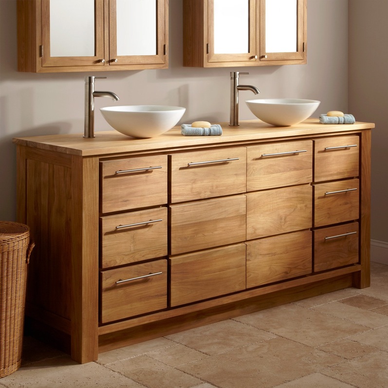 - Το δέντρο είναι φυσικό. Το υλικό είναι φιλικό προς το περιβάλλον. Τα ντουλάπια του μπάνιου είναι επικαλυμμένα με ειδική σύνθεση που δεν επιτρέπει τη ζημιά τους. Για διακόσμηση χρησιμοποιούνται μεταλλικά ή γυάλινα ένθετα. Τα έπιπλα αυτά είναι κατάλληλα για κάθε εσωτερικό χώρο. Αλλά είναι ακριβό.