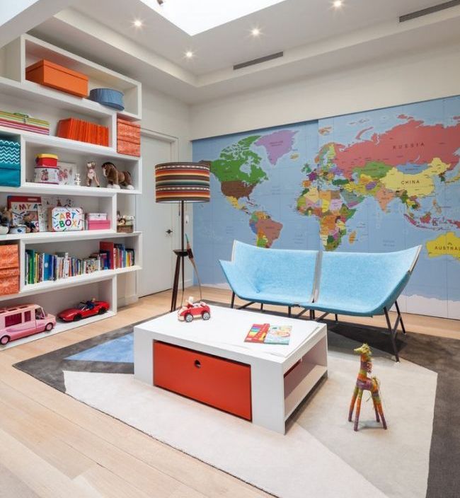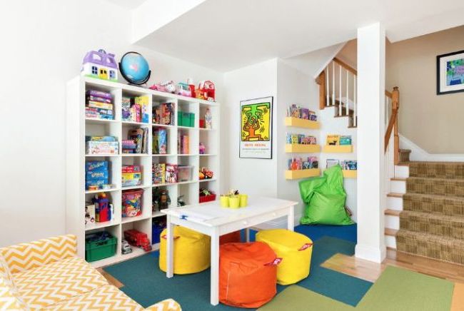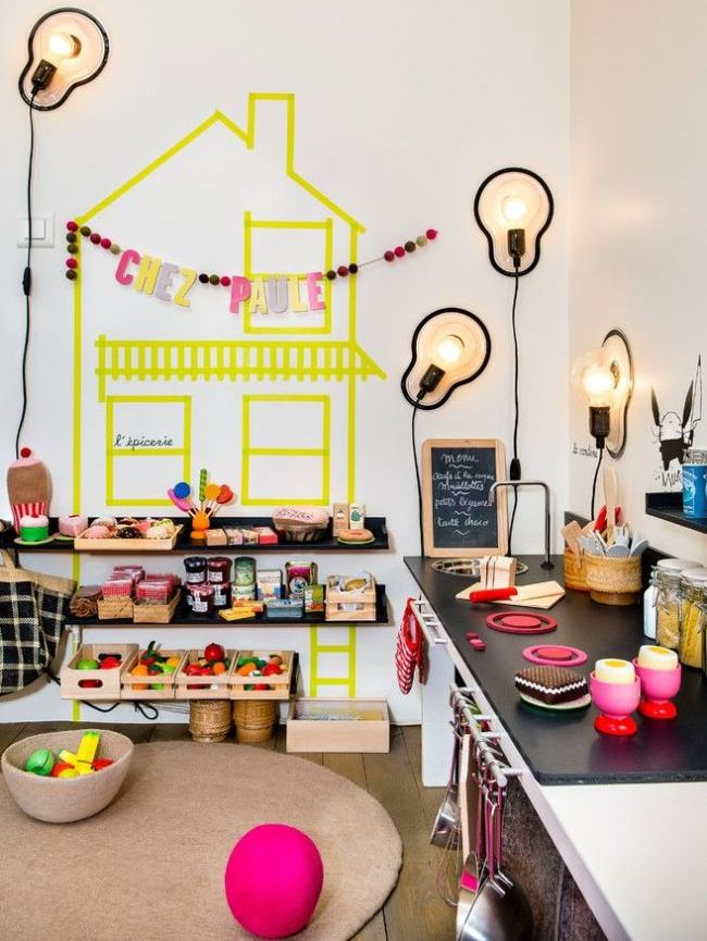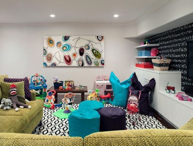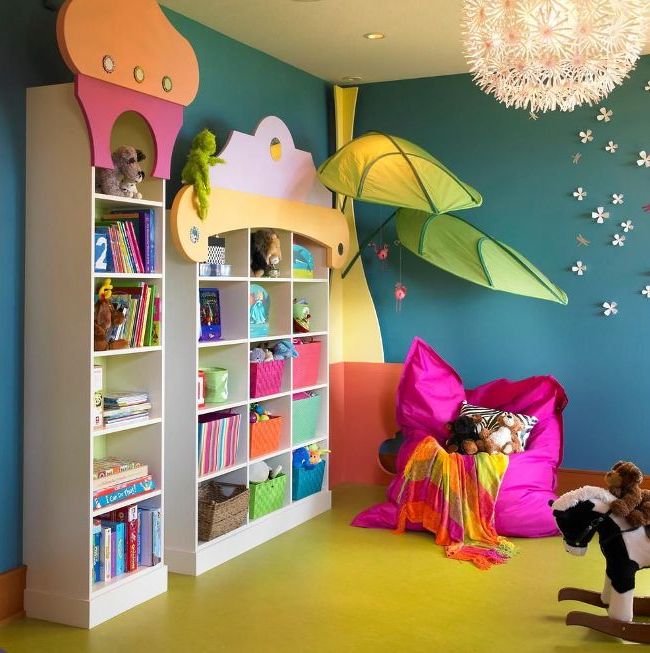 - Use decorations, decoration styles, colors that match children's cartoons. All sorts of heroes of fairy tales, novels, stories, images of cartoon events, located on the walls, floor, ceiling, will be a good solution for decorating the game room in the house.