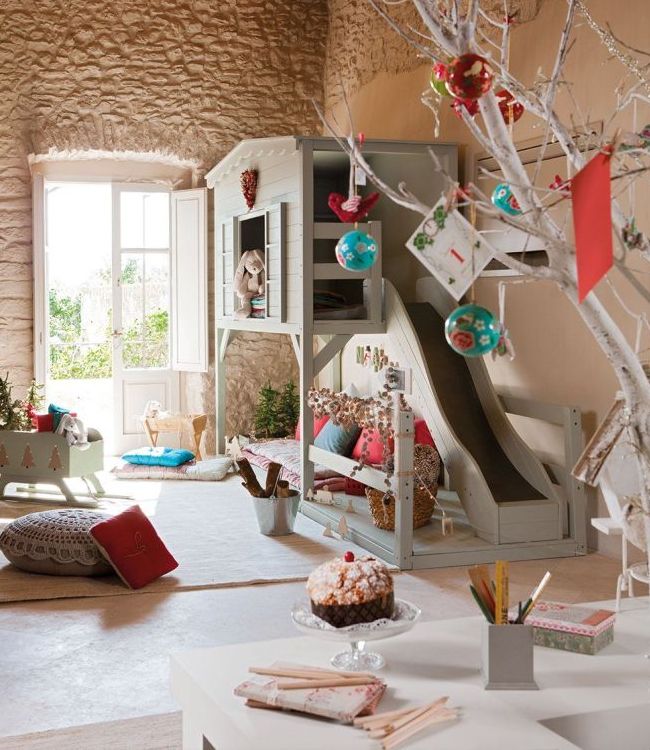 To save space, a functional loft bed equipped with a slide, horizontal bar, rope and Swedish wall will help