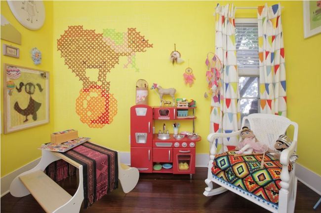 On the walls should be patterns, drawings, images of animals, trees and other children's characters.The vertical arrangement of such a "canvas" favors the artistic attacks of the residents. Try yourself as an artist of childhood dreams. Take on the picture of your playroom. It could be something very worthwhile.