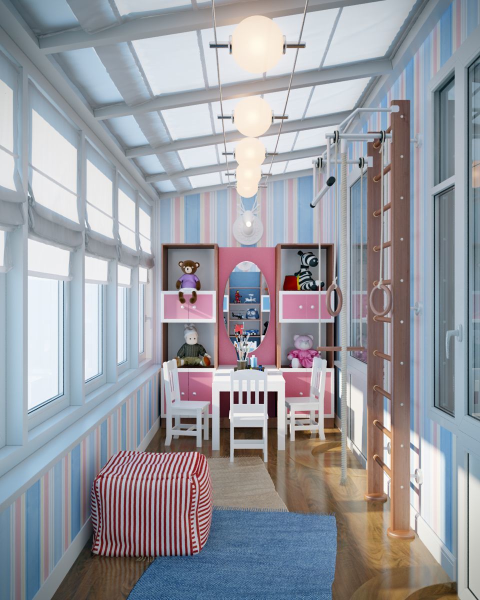 The more free space the playing room, the more comfortable, safer for children. If you need to organize a large number of complexes, slides, stairs, beams, hanging rings, highlight a spacious room.