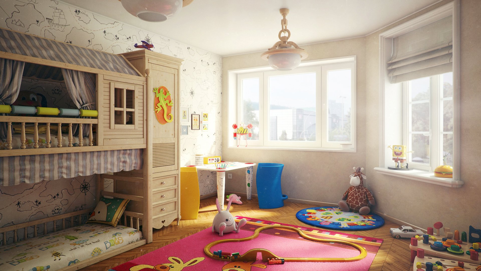 - Lighting should provide good visibility of all areas during the day, evening, and night. Take care of spacious window openings, translucent curtains. Be sure to set a good illumination of all areas of the room, a central chandelier with a large number of bulbs. The health of your child directly depends on this.