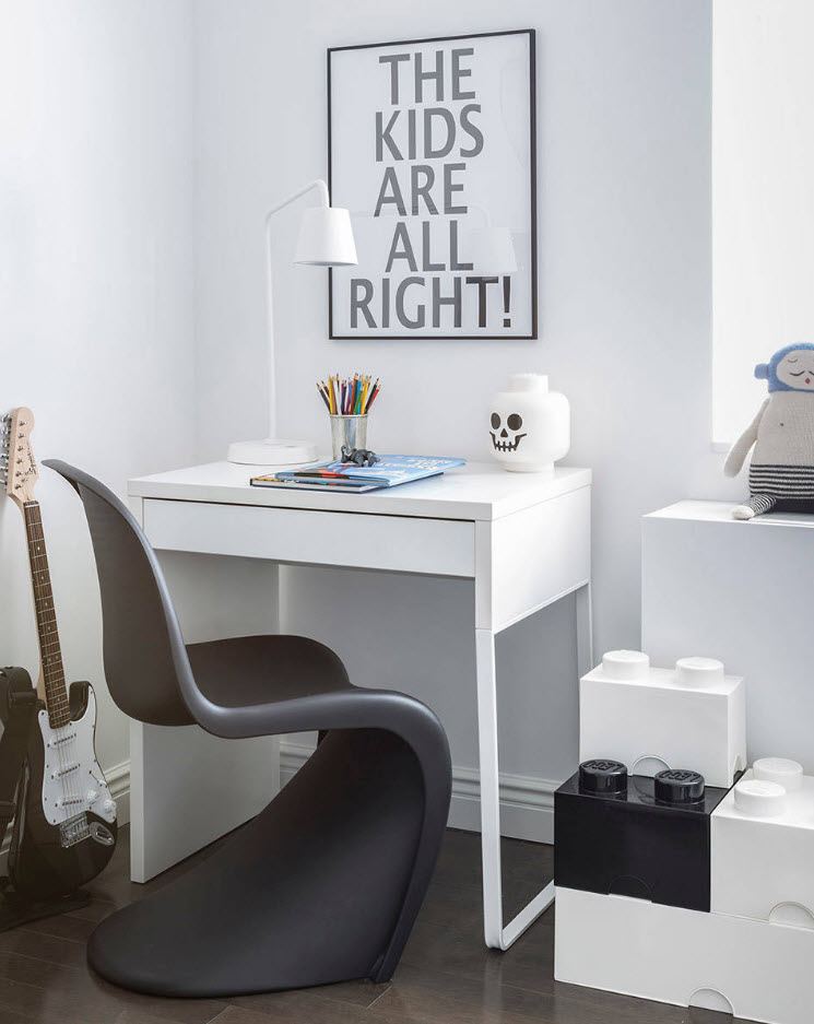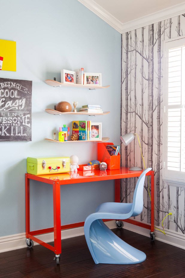 - If space is limited, you can buy a table or desk, designed in neutral colors, without drawings. Some stores offer a service for pasting furniture with colored film. You can order two-color pasting of the countertops.