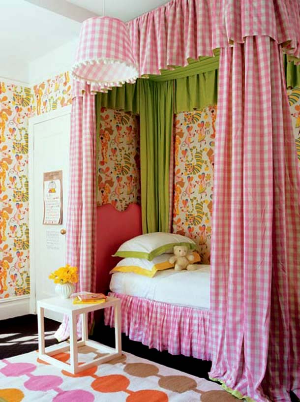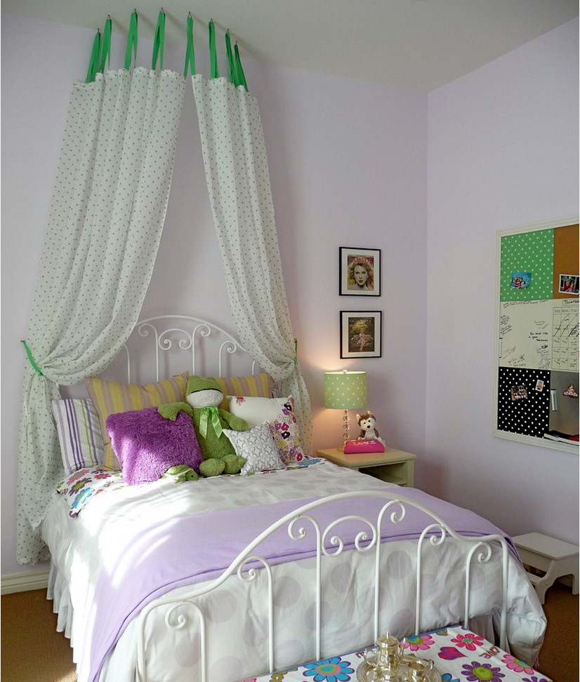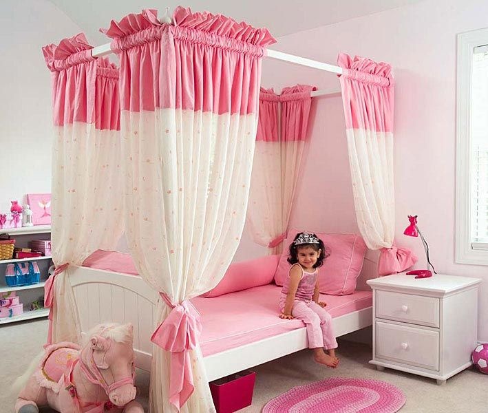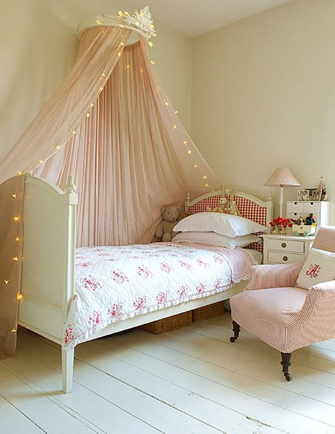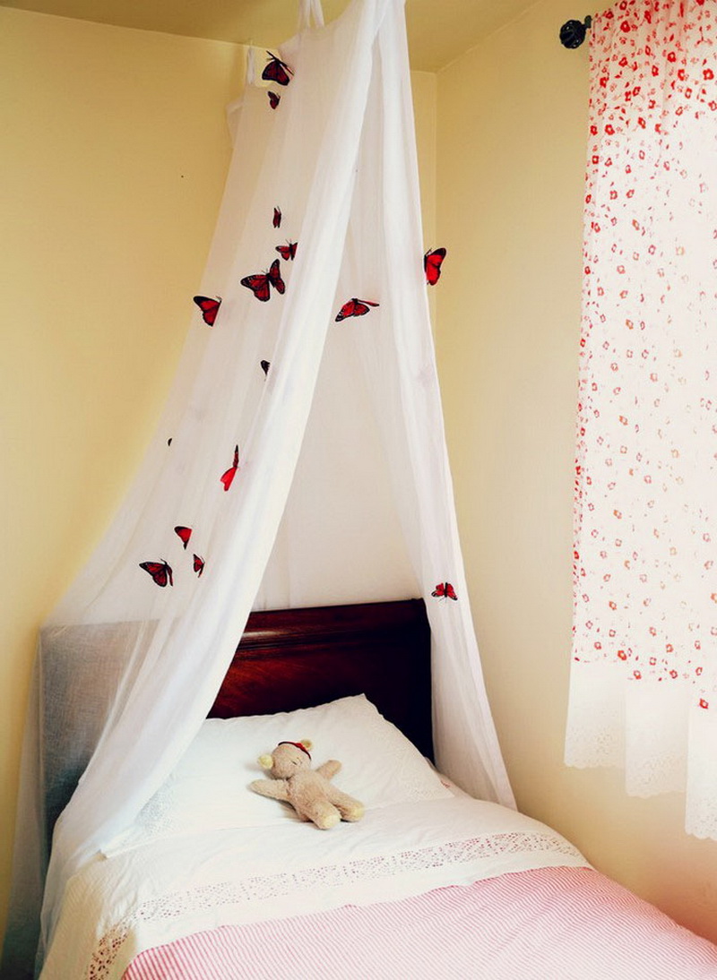 The structure of the organza is more dense, but this fabric, like the tulle, is very good at transmitting light. The advantage of organza is that it is easily combined with other textiles in the room. The color of the fabric for the canopy is very easy to match the color of the curtains for children.