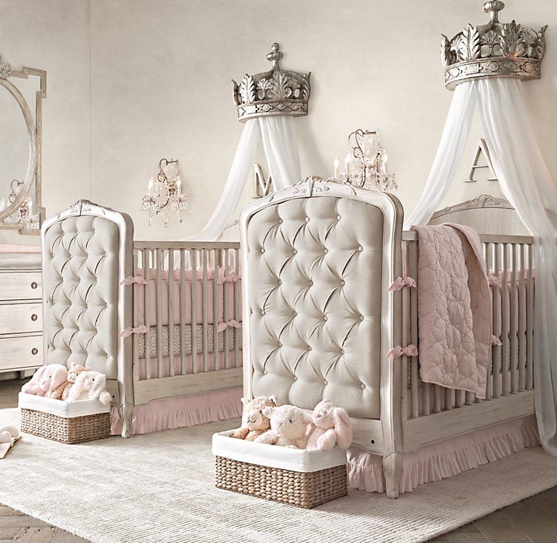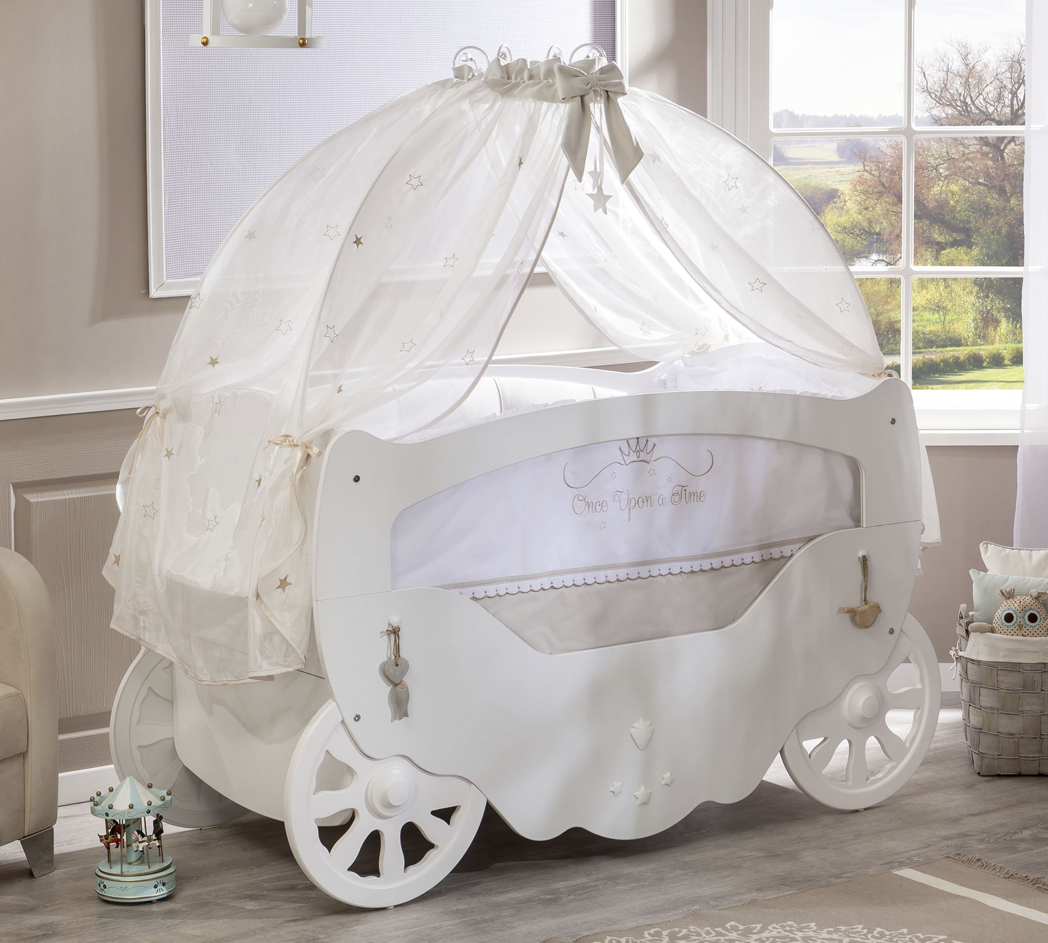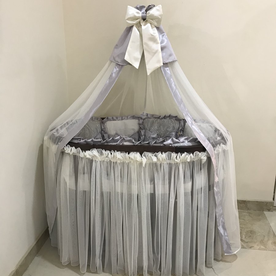 A large canopy around the perimeter of the crib is mounted on a special ceiling cornice