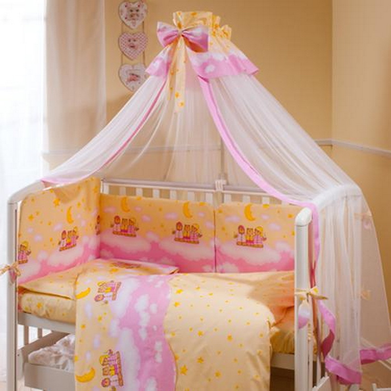 However, if the children's windows face the sunny side, it is better not to opt for a canopy of tulle, but rather prefer more dense fabrics, as bright daylight will disturb the baby’s sleep. Or in this case, it is necessary to foresee the presence of protective curtains on the windows. Tulle has a relatively inexpensive cost, which is also sometimes a decisive factor when buying a canopy.