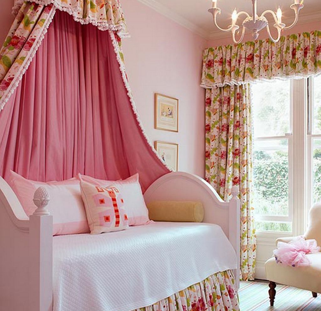 In order for the canopy to fit into the interior, the rest of the textiles in the nursery: curtains, bedspreads, covers for sofas and armchairs, it is desirable to combine with it in color and style. It is not necessary to completely copy the colors and decorations. It is enough to use tones from the same gamut, but darker and add the same accessories.For example, sheathe bedside canopy and curtains on the windows with the same fringe.