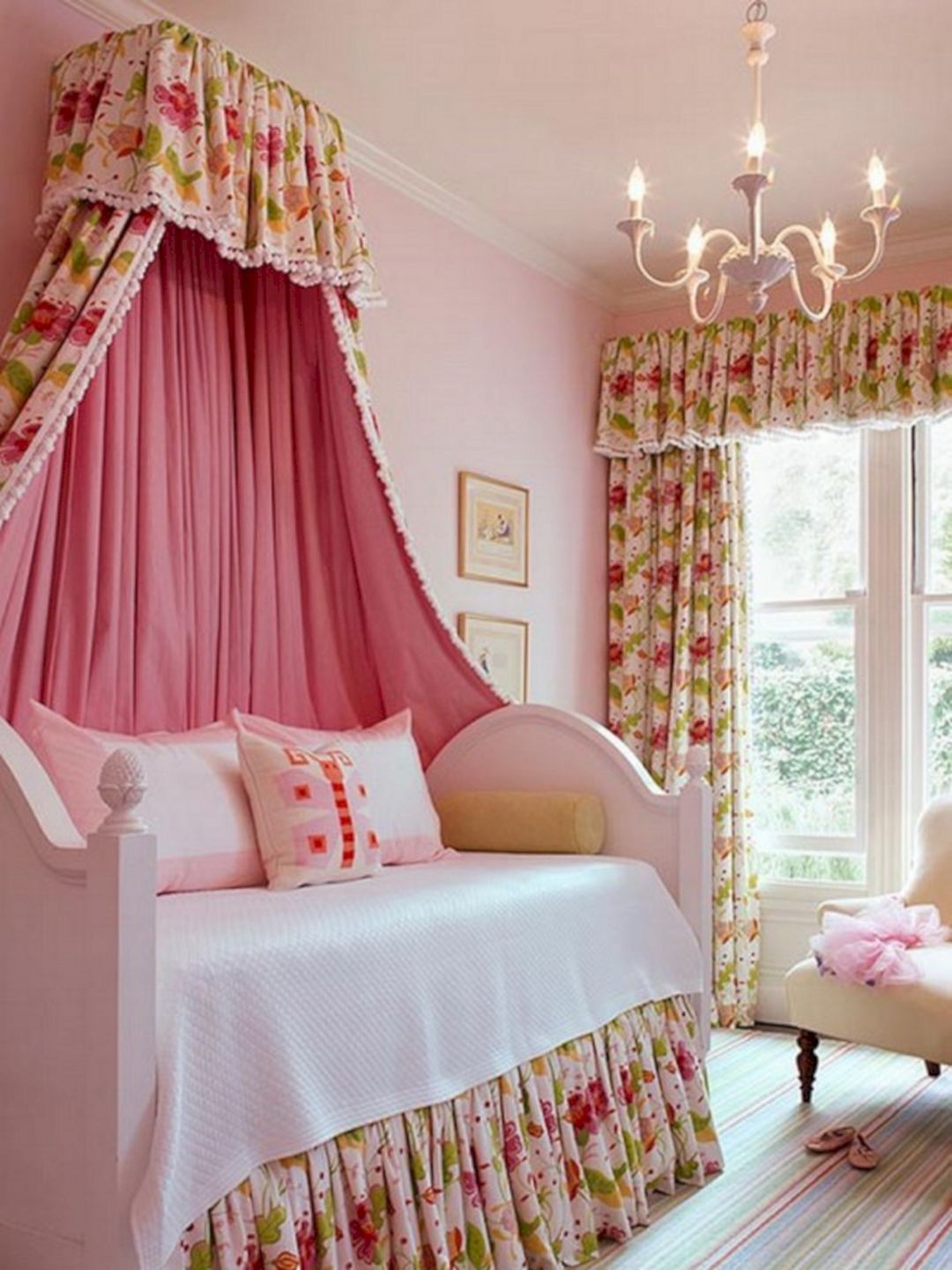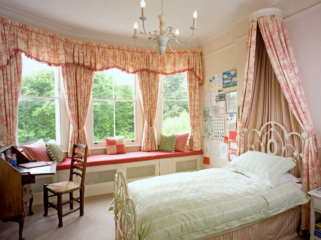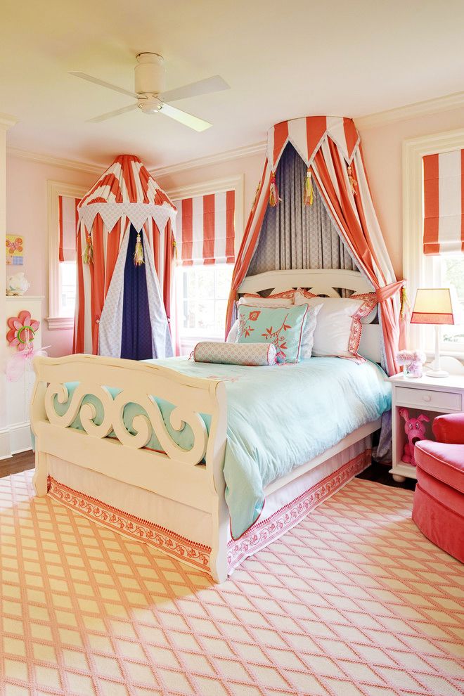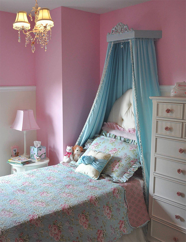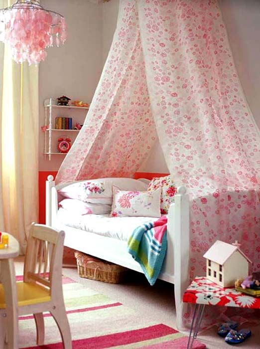 Girls at any age like to feel like princesses, which means they will be happy to sleep under a romantic canopy, both in preschool and in conscious adolescence. Light folds of fabric over the bed will help create a fabulous atmosphere. A small beautiful decorative canopy is enough for this, because its main task is to complement and diversify the interior, to introduce an element of a fairy tale into it.