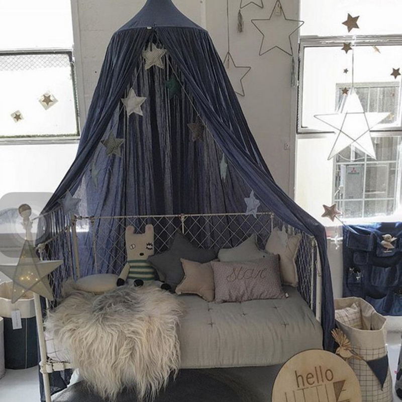 For the construction of the canopy, you can use different fabrics - from the thinnest to dense. The main wish is that the fabric should be natural, pass air well and withstand regular washing without noticeable damage to the appearance. It’s a good idea to use different fabrics depending on the season: in summer, a curtain of light gauze or tulle will protect against mosquitoes and flies that have entered the house and interfere with sleep, in winter, a denser fabric will hide the baby from drafts and a stream of cold air from the window,because the children's room and in winter requires regular ventilation.