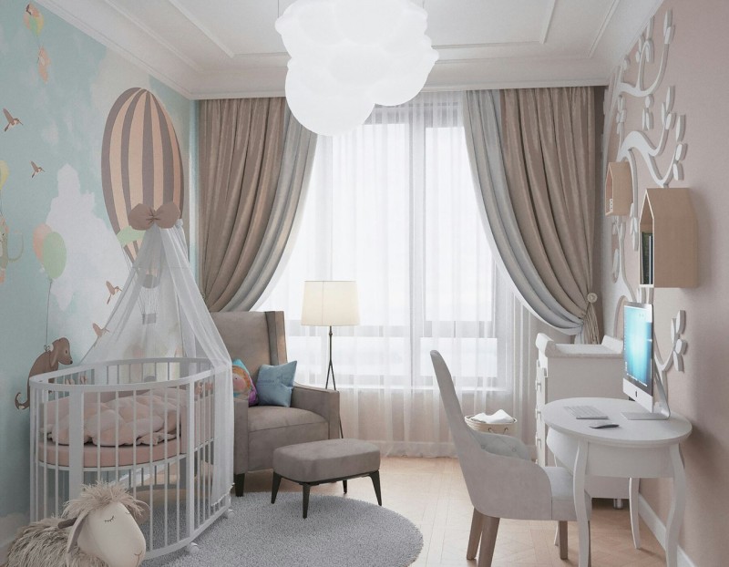 The interior of rooms for small children is traditionally decided in light pastel colors. It can be traditional blue and pink shades for lovers of classics, classic white color or the whole palette of the most delicate shades of beige, pistachio, cream-golden or purple tones. Do not overload the canopies with drawings - plain fabrics look better.