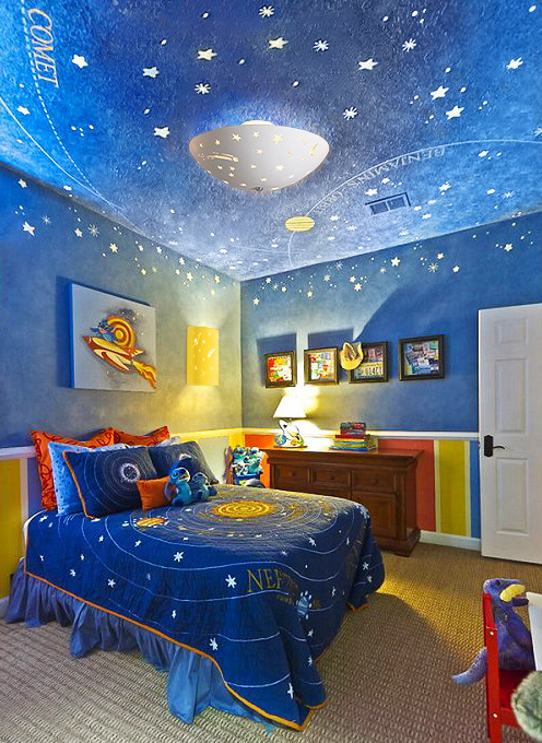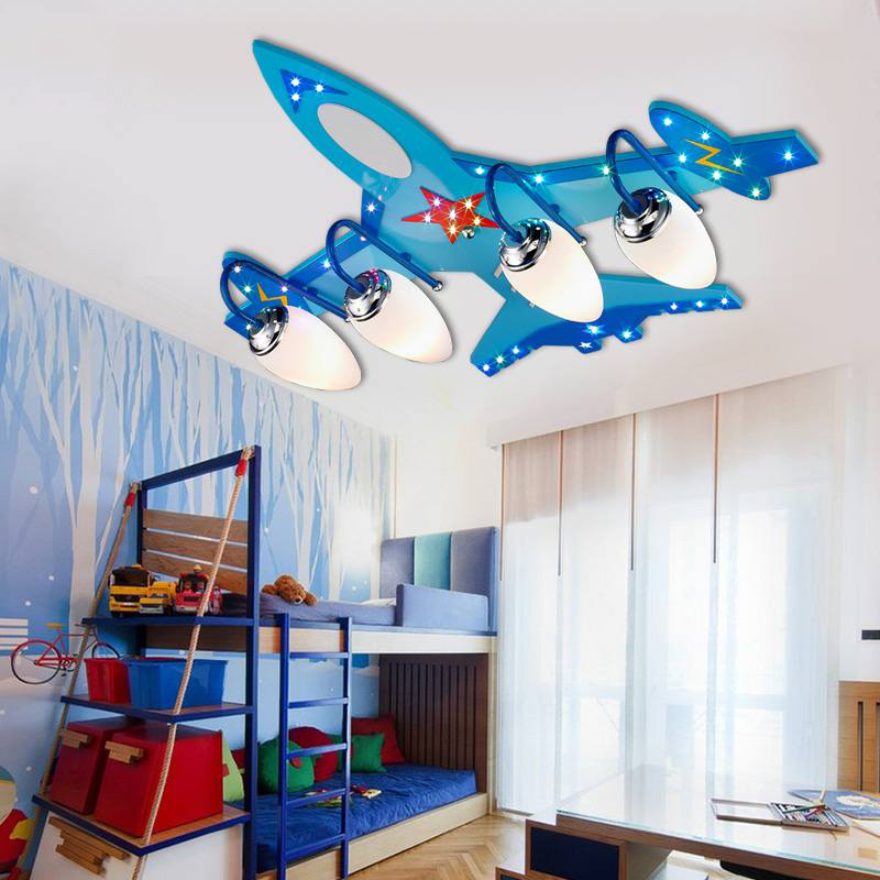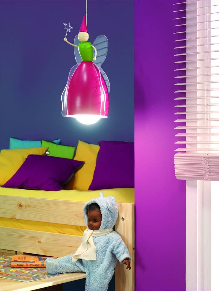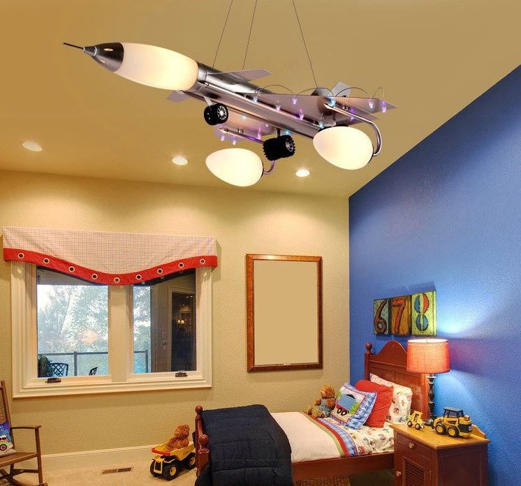 Usually these are chandeliers, the purpose of which is the quality of lighting the entire room or area for games. Such lighting equipment can have different sizes, colors, shapes. Its design often contains interesting decisions by designers. Particularly popular lamps in the form of your favorite cartoon characters, animals, planes, cars, as well as imitating the starry sky.