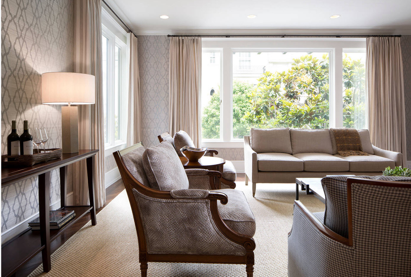Light wallpaper with an unobtrusive pattern harmoniously blends with dark furniture and colorful curtains