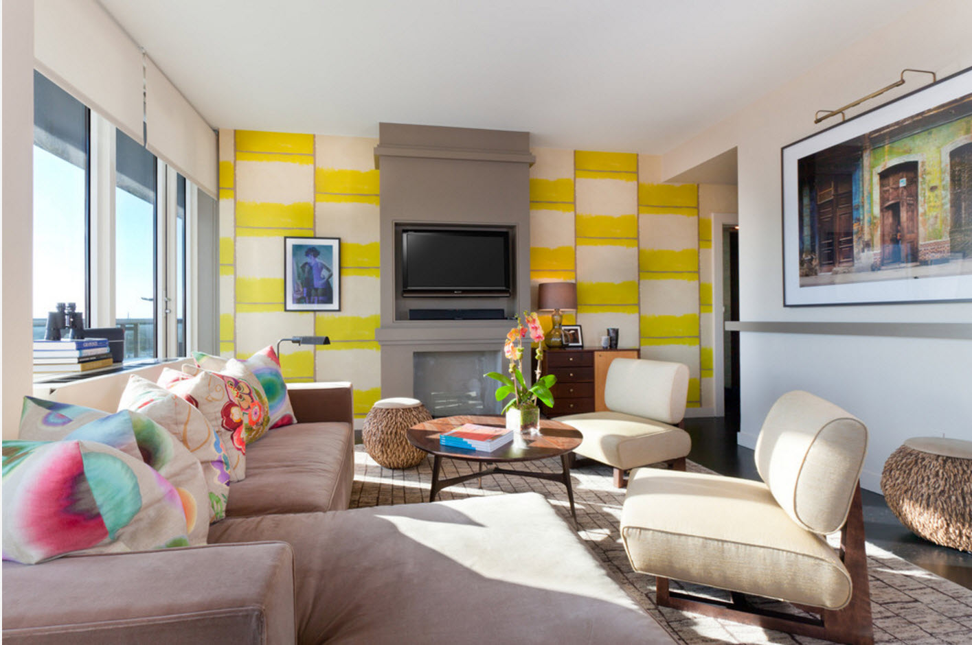 Wall murals do not fade, are easy to clean and environmentally friendly, but require careful preparation of the wall before gluing. This design option should suit the interior in general, and not specifically furniture. A place for photowall-paper should contain all drawing so that its separate parts do not hide behind furniture. The image can be supplemented with backlight, especially if it is a landscape. The end of the picture should fall on the lower corner of the room. If this does not work out, you can use the frame.