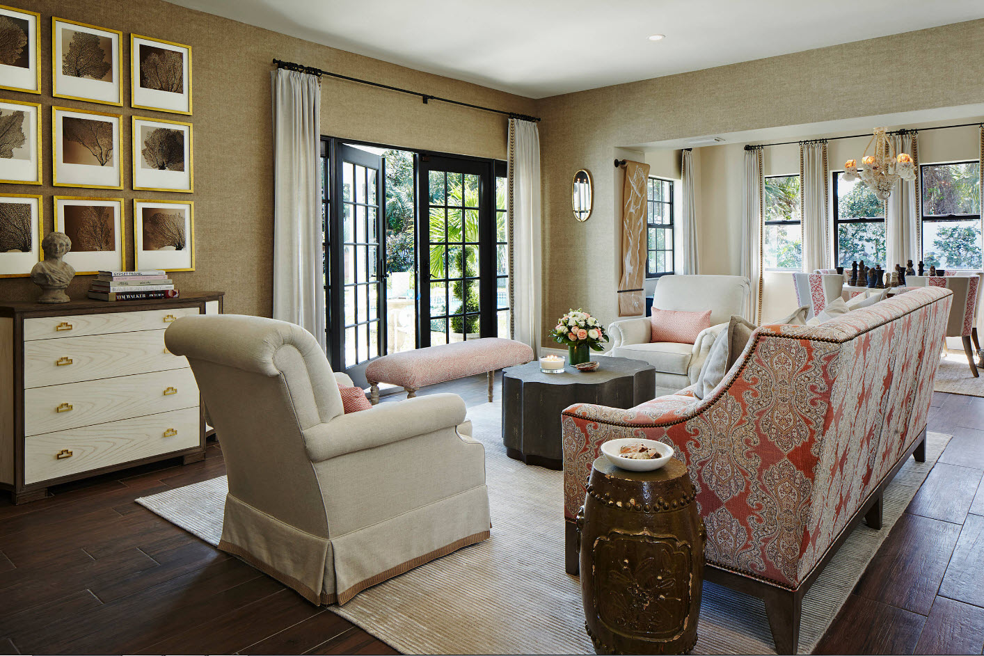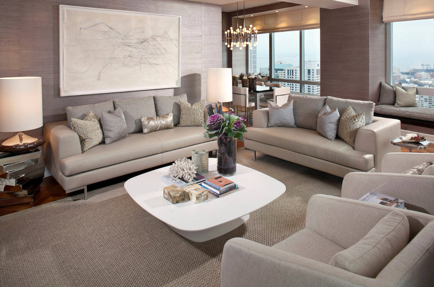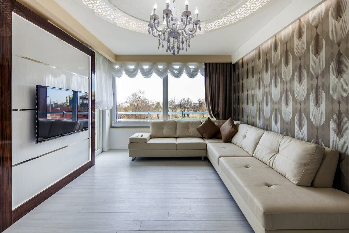 A beautiful solution for the living room will be the neoclassical style. It displays everything traditional, sophisticated and elegant. For decoration, high-quality expensive materials of coffee, pearl and grayish-brown shades are used.