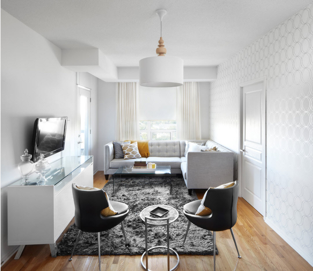 Nevertheless, minimalism is suitable for a small living room with low ceilings, specifically, Swedish and Scandinavian styles of room design. The presence of a large amount of white color, which is combined with cold light shades, is implied.