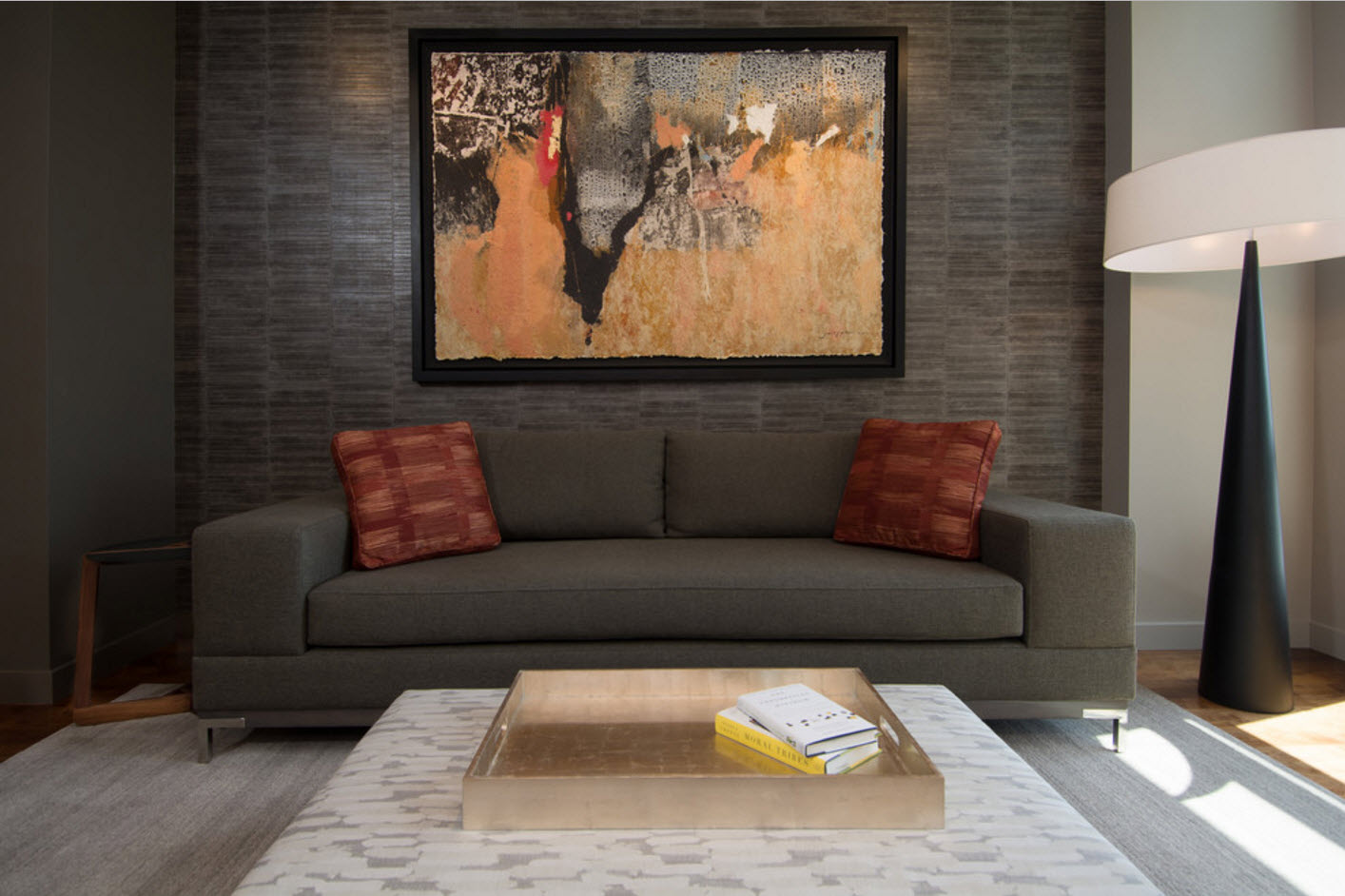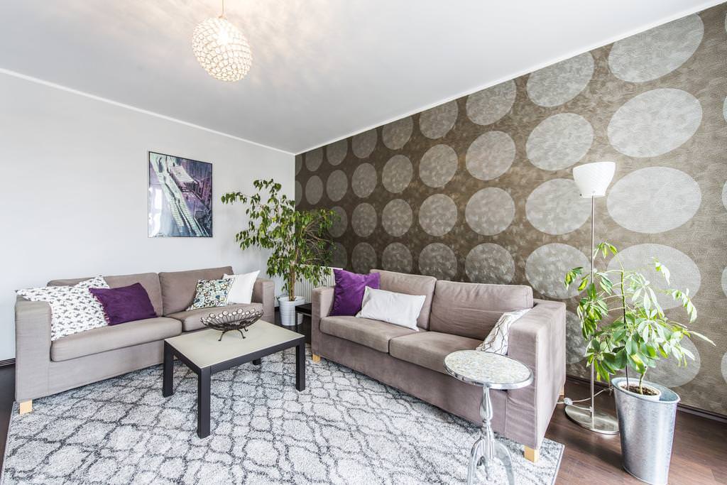 You can focus on furniture by creating contrast. It is enough to choose a wallpaper model with a fuzzy pattern and the tone is darker than the sofa or cabinets.