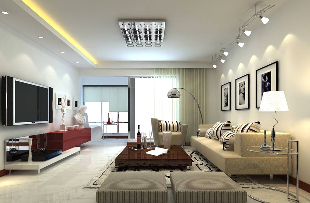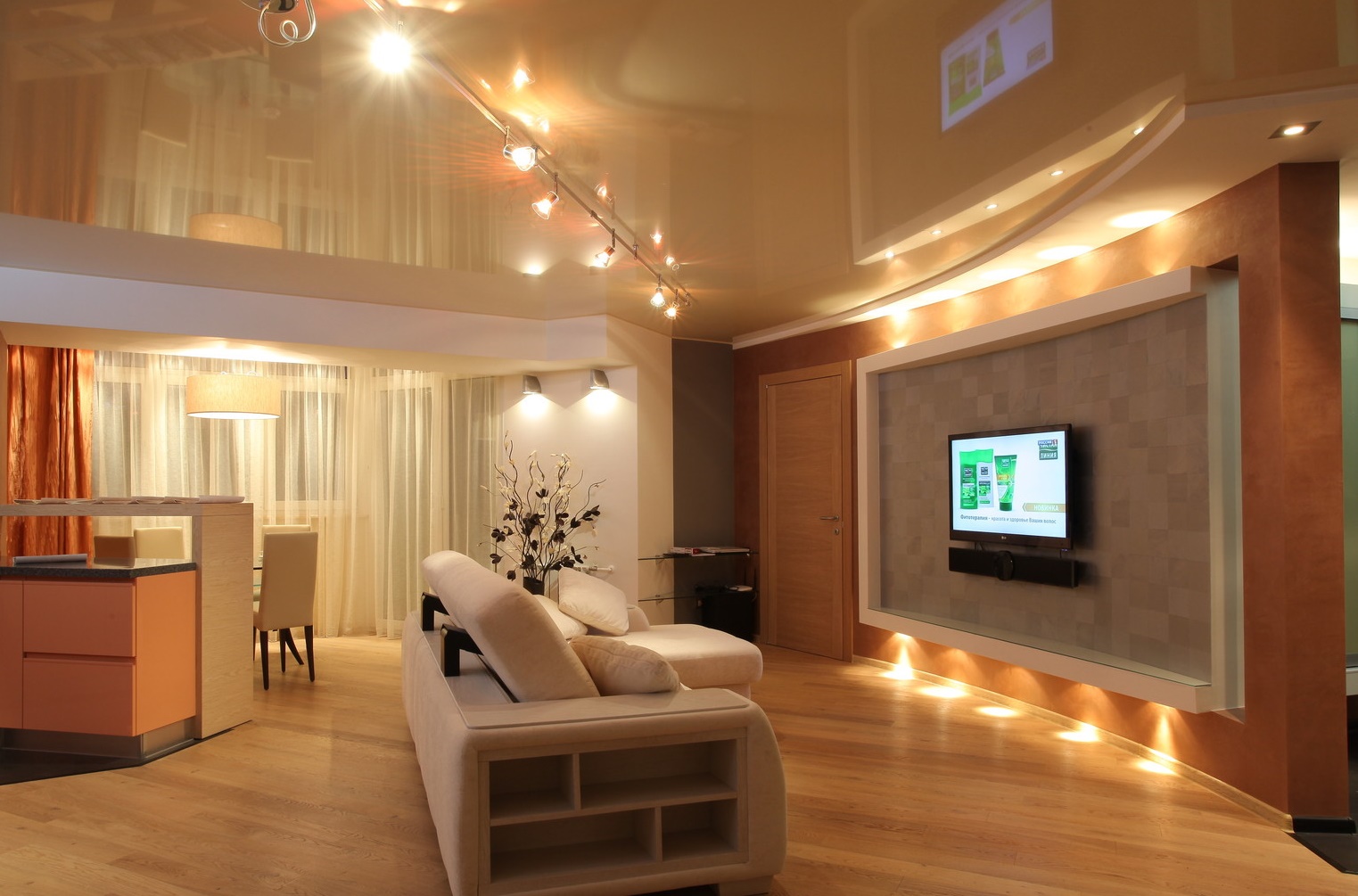 - When calculating the basic lighting design, you need to take into account the area and shape of the room. For a standard room in a typical apartment, one multi-track chandelier will be enough. For an area of over 25 square meters. m. it is necessary to increase the number of light sources. In this case, built-in or track lights are well suited. If the living room has a rectangular shape - it is advisable to install two light sources at opposite ends of the room.