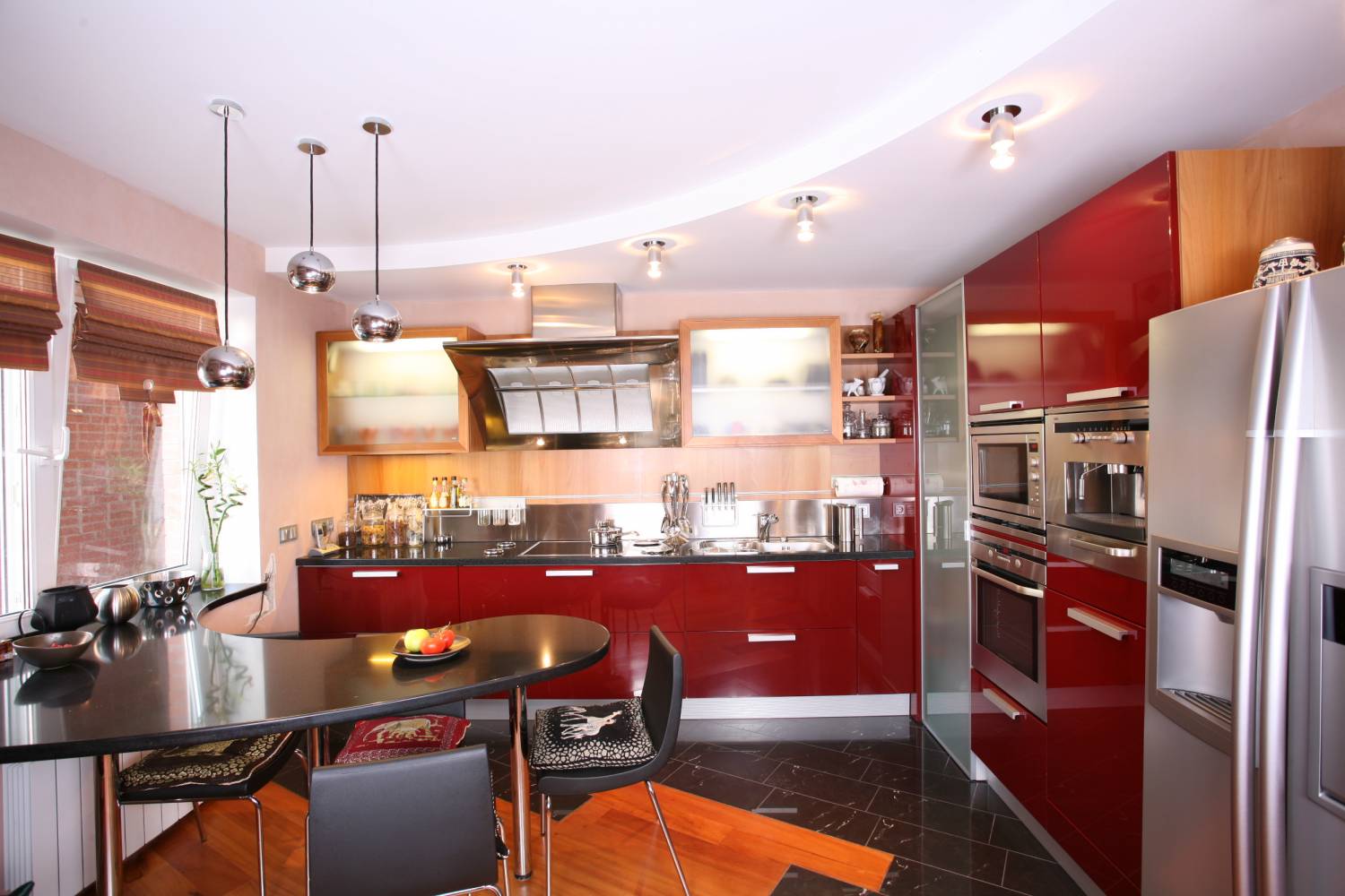 The basic lighting in the kitchen should not be too bright, since the first thing you need is the illumination of work surfaces. This is a table on which food is cooked, a stove or a hob. As an additional illumination of the stove, hoods with built-in backlight are used. In the dining area, a softer and warmer light is appropriate.