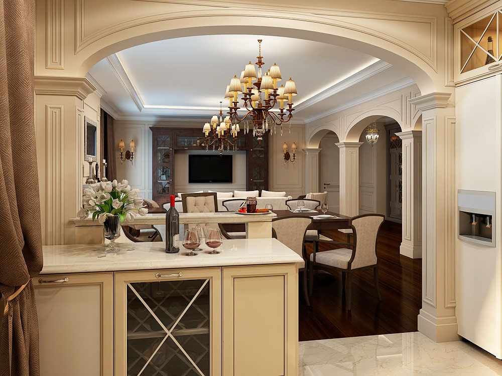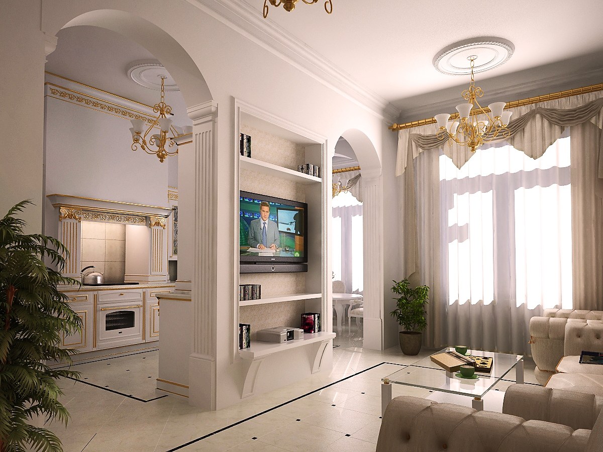 Most importantly, do not mix the design of the arch with a different style. For example, make the interior in a classic, neoclassical, Roman or Greek style. Although, for a neoclassic, a wooden arch is more suitable than gypsum stucco. Try to make sure that all elements create a harmonious atmosphere.