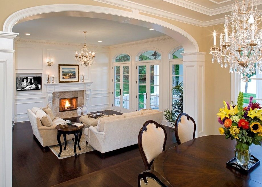 The living room can be divided into two zones. The main thing is that the shape of the arch is combined with the door that closes the living room. It is not necessary to install arches everywhere in the house, if you have a large living room, then it is quite realistic to make two rooms, or zones, from it. For example, one zone is intended for gatherings with family or friends, the other for privacy, you can install a bookcase and one or two soft chairs.