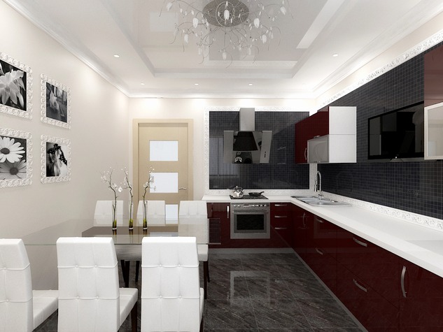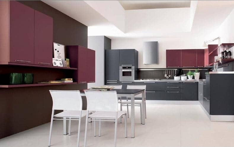 The combination of rich burgundy with black looks gloomy, but the presence of modules with white facades makes the interior more interesting.